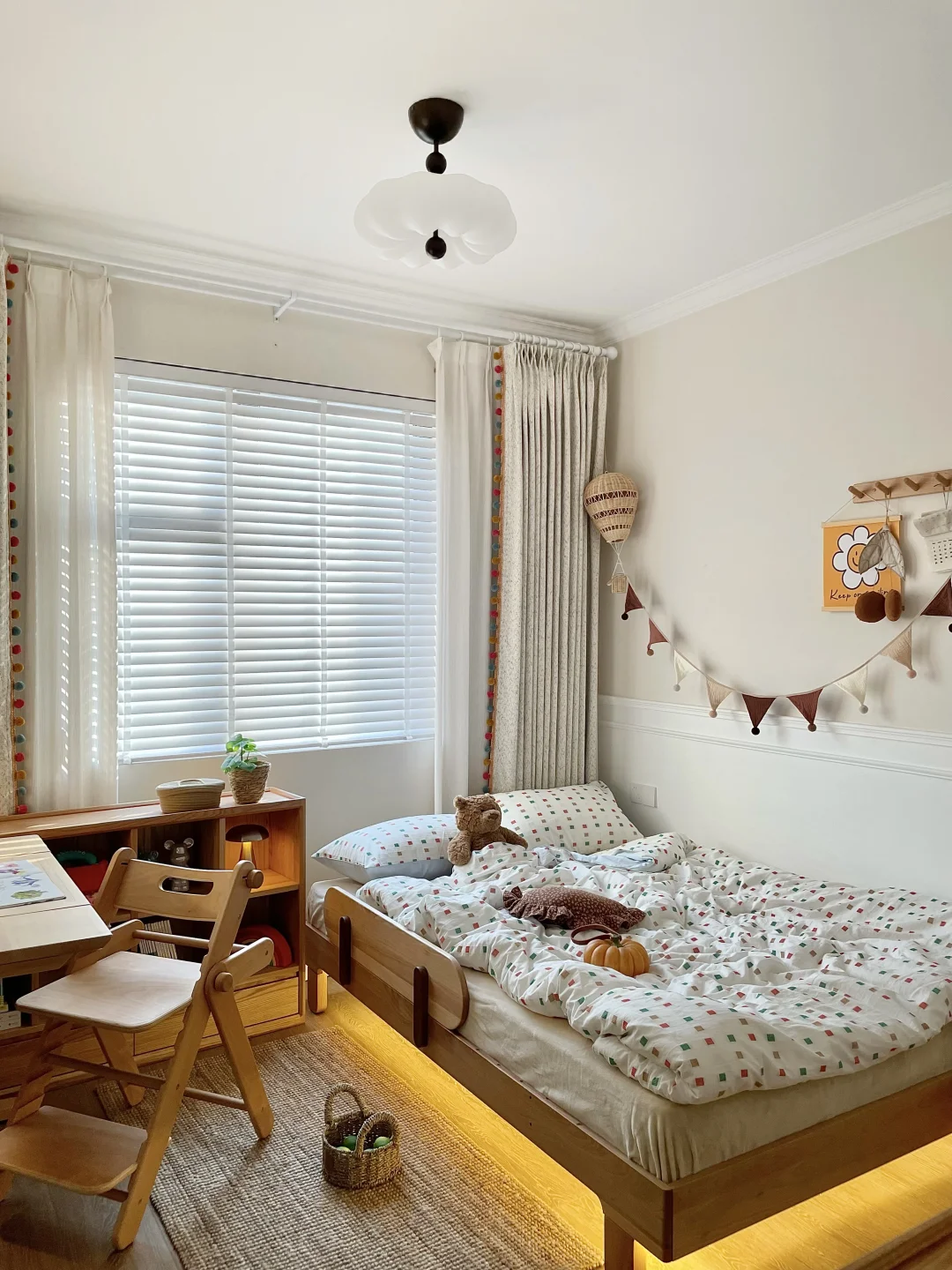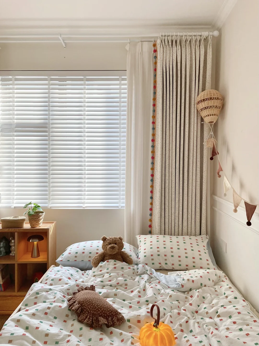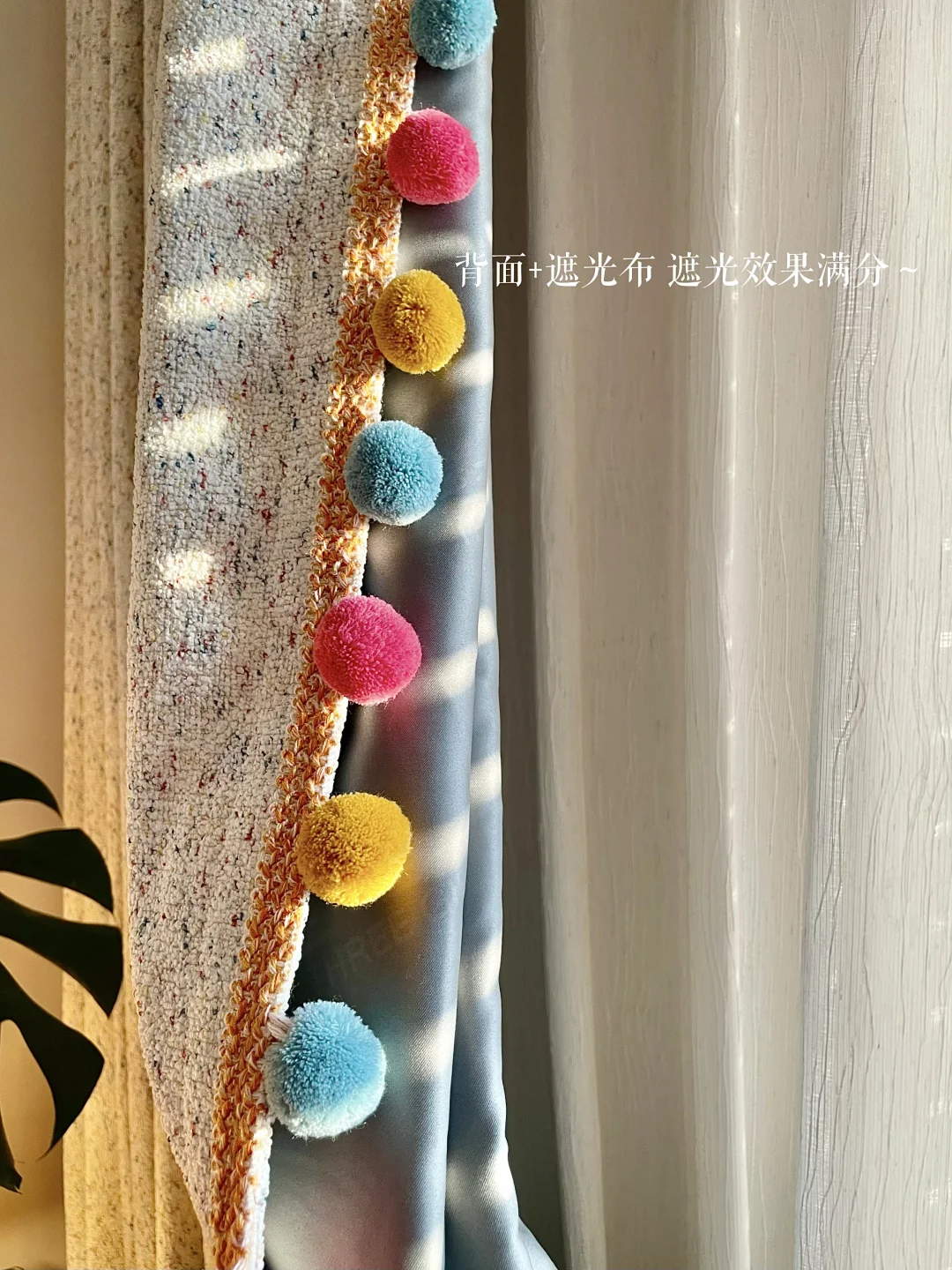 奶油色底布上撒着细碎彩点,像把调色盘搬进房间,侧边的彩色毛球花边,童趣感拉满🍬~特意加了一层遮光布,周末白天拉上能睡个安稳午觉,不怕阳光☀️刺眼~老母亲也能偷个懒😄