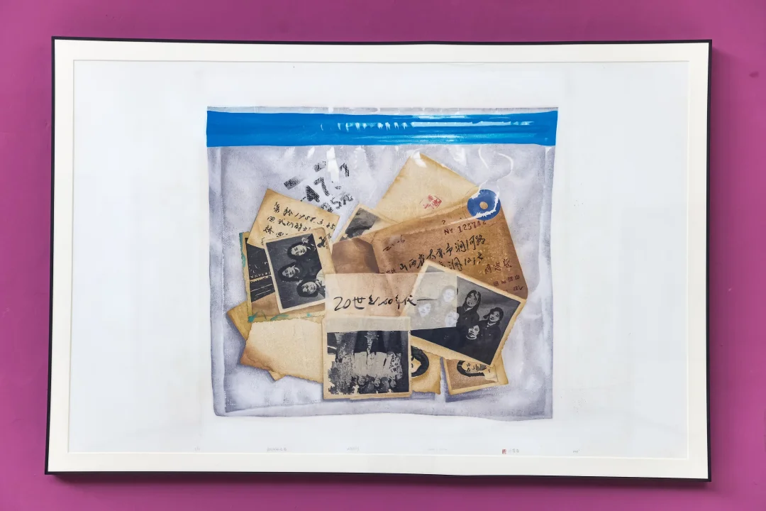 那天在四川美术学院美术馆,一进门就被墙上那幅装在透明密封袋里的旧照片拼贴吸引了。泛黄的相纸上印着黑白合影,蓝色封条和手写日期在暖调背景里特别醒目,像是把某个时代的记忆封存起来了。