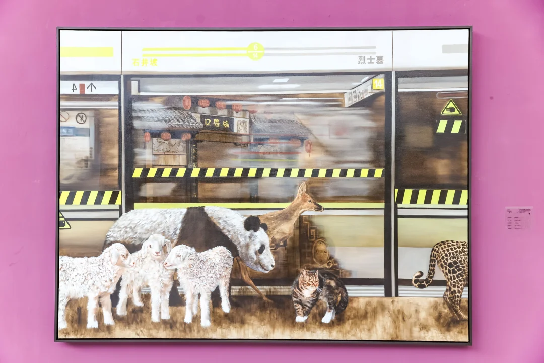 转到另一侧展厅,整面墙的当代艺术作品让我挪不开眼。那只粉紫色调的狐狸画像旁边,还有几幅蓝绿渐变的抽象画,笔触里能感受到颜料堆叠的厚度。转到转角处突然撞见超现实的地铁场景——熊猫和绵羊在站台上散步,豹子尾巴从车厢里探出来,现实和非现实的边界被打破得恰到好处。