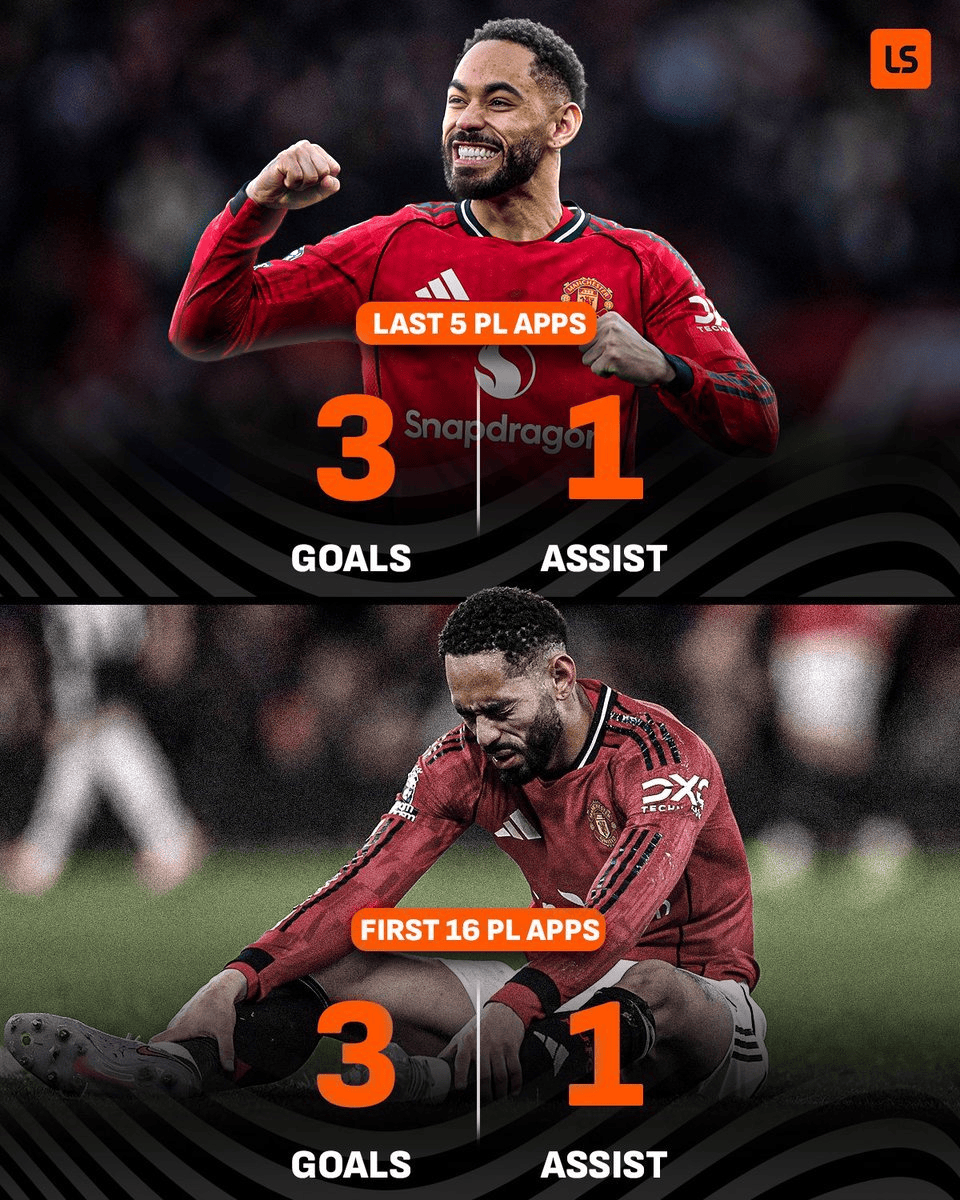 库尼亚近5场英超贡献3球1助,与在曼联的前16场联赛数据相同
