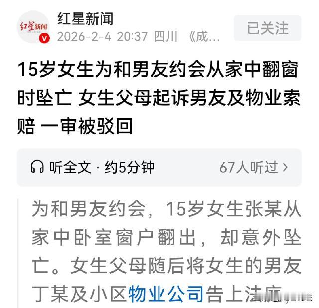 这可真是太可惜了!河南,一个15岁的女孩在网上谈恋爱,认识一男子之后俩人偷偷约会,甚至还到外面开个房间滚床单。有一次,男子又想要跟女孩私会,就给女孩暗示说:你翻窗户逃出来,咱俩溜走。没想到,女孩照做了,但是却不小心受伤、最后离世了。男子看到这一幕,也没有帮忙救治,而是脚底抹油逃跑了。 (本新闻参考来源:红星新闻报道) 这可真是一件非常悲伤的事件,孩子才15岁,被男子唆使做出不安全的举动,这下家属可伤心了。 15岁的小张,正处于叛逆期,跟父母闹了之后,不想上学了,直接就把书包扔掉了,然后就跑到外面去打工了。 打工期间,小张很喜欢上网,回头竟然在网上谈起了恋爱,认识了一位男子丁某,这个丁某,比小张大了十几岁。 但是小张丝毫不介意,暗地里还是在跟丁某交往,一点都没有让自己的父母知道这件事。 后来,丁某一再恳求,希望小张可以跟他出去开房。年少不经事的小张,还真的就跟丁某约了出去开房,开房之后,这个女孩就跟网上的这个男友,在酒店里发生了不该去做的事情。 再之后,丁某成天想要跟小张黏在一起,就想要让小张出来,跟他一起同居。 而小张的心性根本尚不成熟,男友让她干啥,她就照做。就这样,俩人经常外出同居。 本来这件事小张就是背着父母去做的,但是,这个女娃子每次都是怎么偷偷溜出去的呢? 原来,小张的卧室外面,有一个走廊,每次只要翻过这个走廊,就可以快速逃离家,就可以跟丁某顺利的逃出去约会。 到事发这一天,小张再次翻出了走廊,但是没想到,这次发生了意外,当小张准备翻越窗户的时候,并没有跳到走廊上面,不小心就掉下去了。 没多久之后,小张也就失去了呼吸。可惜孩子才15岁,就这样殒命。 前来接应的丁某正好就看到了这一幕,他很害怕,生怕追究自己的责任,也没有及时打电话施救,而是一溜烟跑掉了。 办案人员介入调查之后,排除了刑事案件。 而得知真相之后的小张家属,就不乐意了。看到女儿意外离世,他们悲痛欲绝,一纸诉状,直接把成年的丁某跟物业给上诉了。 家属的诉求是: 第一,丁某作为成年人,却私会自己的未成年女儿,还唆使她做危险的事情,最后不小心造成意外,因此丁某需要担责。 第二,小区物业,面对陌生男人进入小区,物业不作为,甚至在危险地段不设置护栏,也没有禁止攀爬的警示牌。 小张家属要求丁某跟物业赔偿30万元损失费用。 相关部门是怎么判定的呢? 对于丁某而言,从法律上来说,很难下定论,因为行为是小张自己所为,她自己去做的危险行为,因此需要自己承担因果关系。但是跟未成年人约会,道德上存在瑕疵。 对于物业而言,经过各方面勘察,房屋建筑等各方面经过验收之后均合格,设施也符合安全规范,也不存在需要设置警示牌一说。 最后,相关部门依法驳回小张家属的全部诉求。 本案释法: 男子给15岁女孩出主意,唆使女孩翻阅窗户,最后不小心出意外离世,男子是否需要承担法律责任呢? 根据《刑法》第二十九条规定,教唆他人犯罪的,应当按照其在共同犯罪中所起的作用处罚。如果存在教唆不满十八周岁的人犯罪的,还应当从重处罚。 所以说,本案中的丁某,如果有确凿的证据可以证明,他确实唆使了15岁的小张翻墙,即使没有直接实施行为,也可能构成教唆犯罪,需要承担相应的法律责任。 尤其是面对未成年,法律上更加要从重处罚。但是问题是,如果没有证据可以证明丁某有唆使的行为,则很难去追究他的刑事责任。 面对小张家属的诉求,请求给丁某定罪,但是在调查之后发现,并没有证据可以证明小张的男友曾经诱导小张去翻阅窗户,最后则论定为:翻阅窗户,是女孩小张自己的选择。 所以最后,对于丁某,则难以追责。 这个案件走到最后,看着很可惜,家属面对两个可能的责任方,均无法追责。而自己那未成年的女儿,却因此离世,父母每每想到此事都很悲伤。 对此,您怎么看呢,欢迎评论区留言一起来讨论吧!