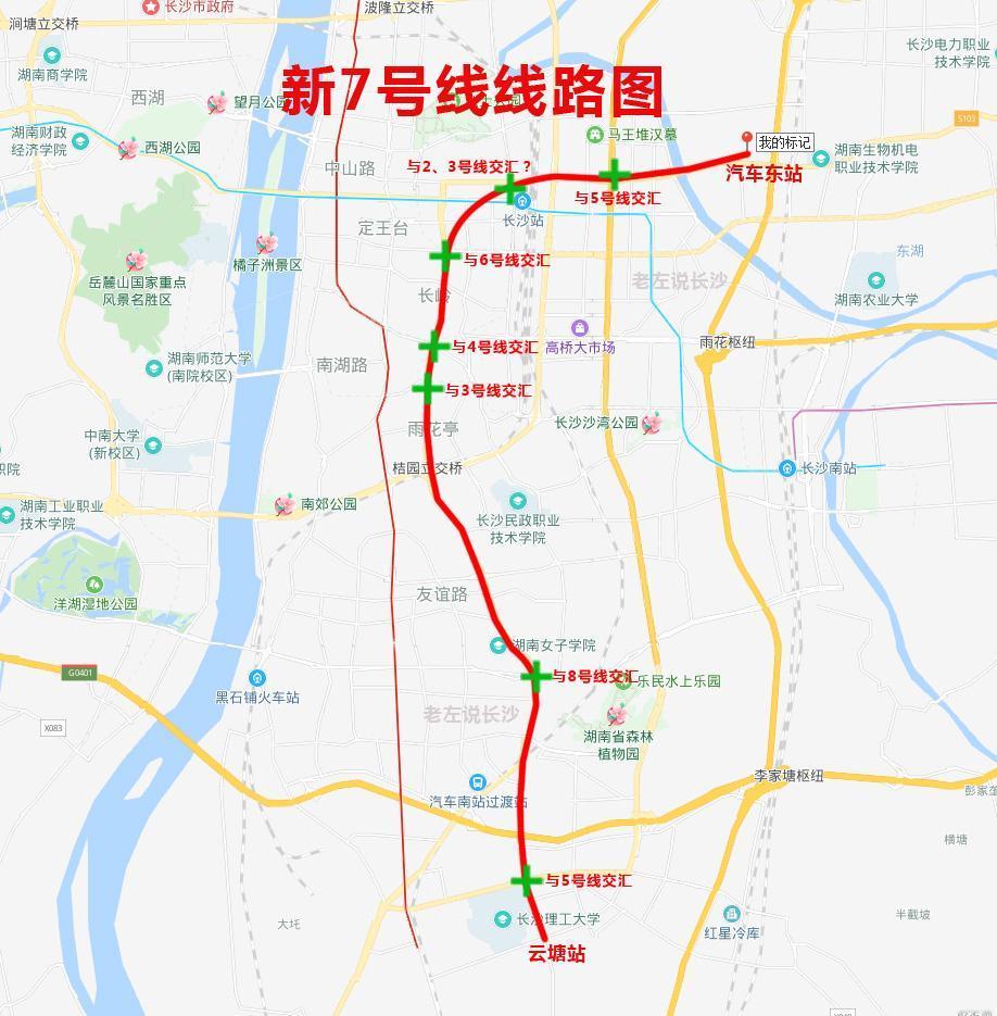 长沙地铁7号线 长沙地铁7号线是长沙首条全自动运行的地铁线路,预计于2027年开通运营,将显著缓解河东主城区南北向的交通压力。 7号线一期沿汇金路、韶山路、八一路敷设,贯穿长沙河东主城区南北中轴,途经天心区、雨花区、芙蓉区,串联多个核心板块。 ‌ 该线路覆盖市中心医院、湖南省中医附一医院、市妇幼保健院、湘雅二医院4所大型医院;服务长沙理工大学、中南林业科技大学、中南大学铁道学院、湖南中医药大学等4所高校。 ‌长沙轨道交通7号线一期工程(云塘站—五里牌站)线路长度‌约16.84公里(部分资料为17.305公里),车站数量‌共设16座地下站,均为地下车站。该线路有9座换乘站,可与多条既有和规划线路接驳,包括2号线、3号线、4号线、5号线、6号线及长株潭城际铁路等。 ‌ ‌列车采用6节编组A型列车,最高运行时速80公里,采用GoA4级全自动驾驶系统,为长沙首条无人驾驶地铁线路。长沙地铁 地铁7号线沿线 7号线沿线 7新村路地铁 7号线通车 长沙城际线