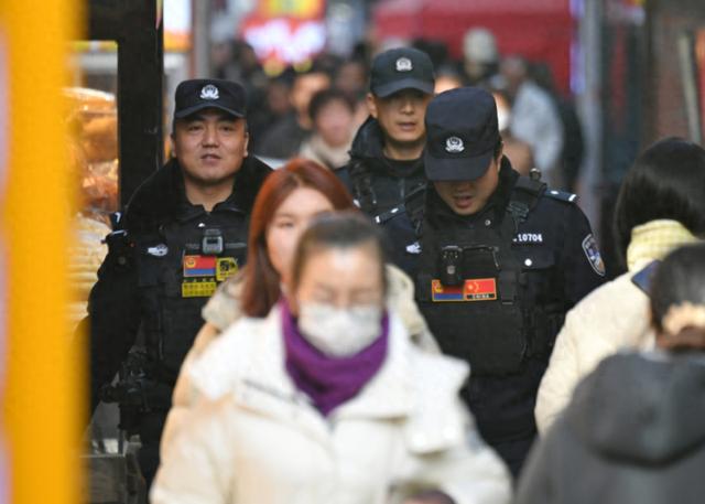 2月6日,西宁市水井巷熙熙攘攘,西宁市公安局城中公安分局的民警在市场内巡逻。春节临近,西宁各大市场采购年货的人流量增加,西宁市公安局各派出所抽调民警加强市场巡逻,保障市民平安出行购物。