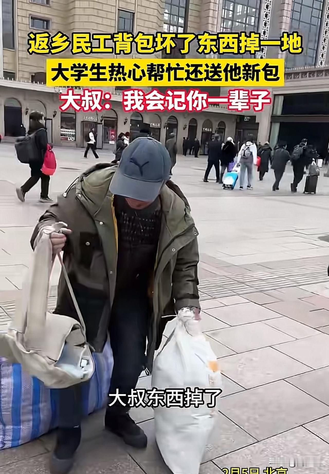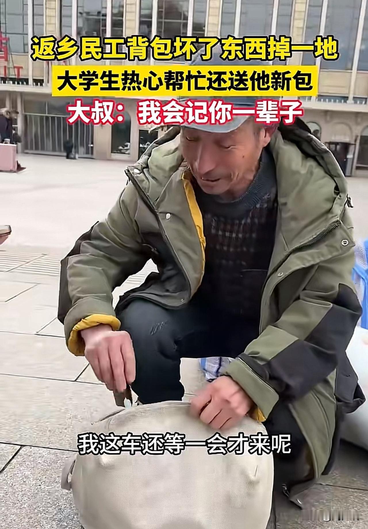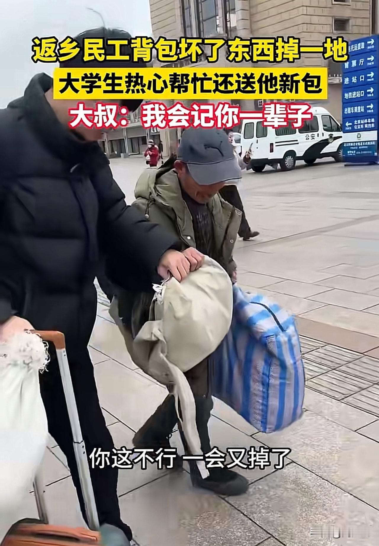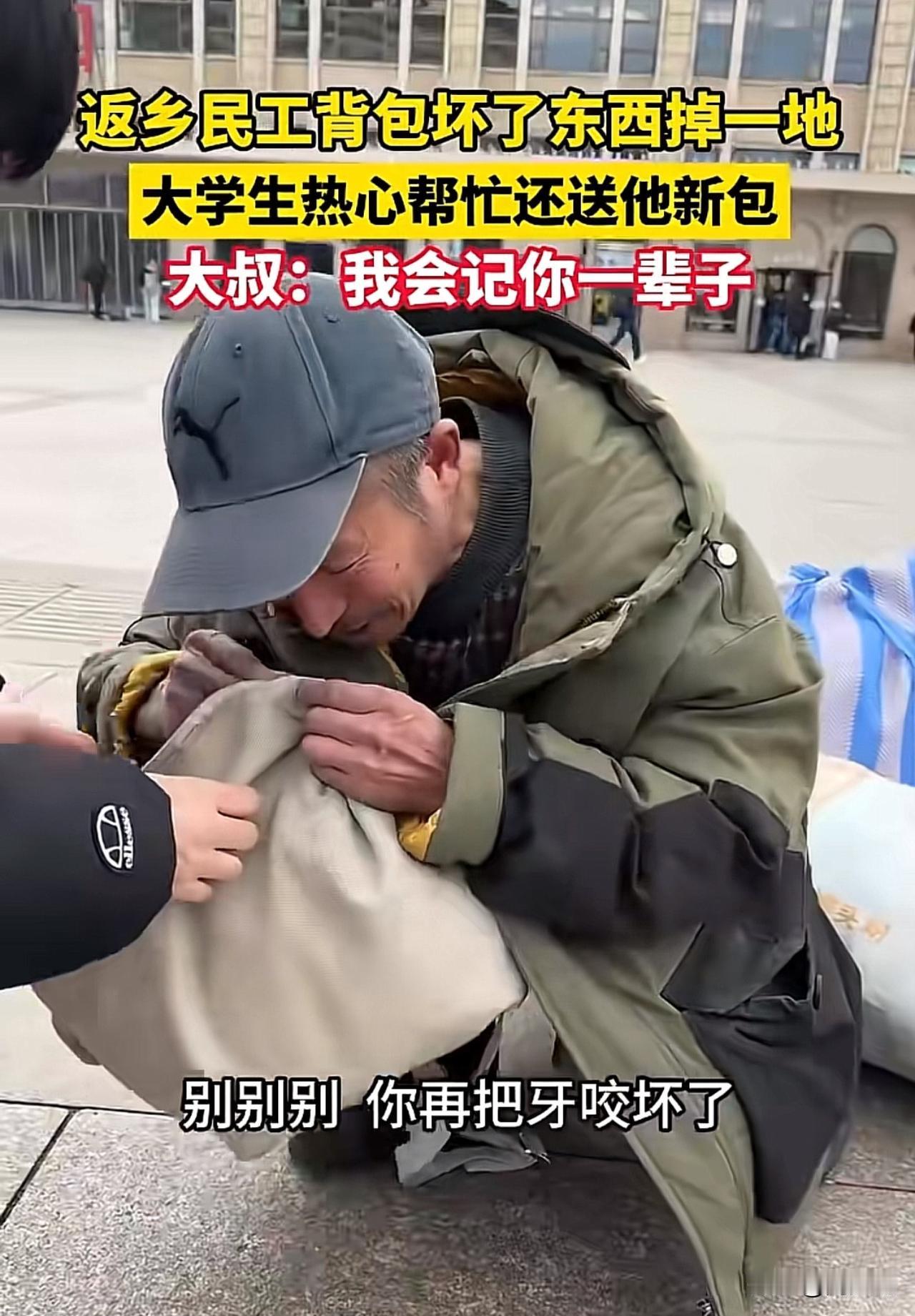 “暖哭!”刷到一个视频,返乡路上,一位民工大叔的背包突然崩开,衣物、工具散落一地,急得他手足无措。正当大叔蹲在路边慌忙捡拾时,路过的一名大学生主动停下脚步,蹲下身帮忙整理,还给大叔买了新背包递过去。大叔感动得热泪盈眶,坦言“我会记你一辈子”。 这一幕被路人拍下,迅速在网络热传。众多网友纷纷留言:“看到这场景心里暖暖的,大学生没一点架子”。 也有网友说:“小事见人品,愿意弯腰帮陌生人的年轻人,真的很可贵”。 还有网友表示:“大叔那句‘我会记你一辈子’,藏着最朴实的感激”。 可以说,这场意外中的暖心互动,恰是一堂生动的品德教育课。年轻人或许没有惊天动地的壮举,但这份主动伸出援手的善意,正是当下社会需要的温度。 在快节奏的生活里,不少人习惯了步履匆匆,却忘了身边人可能需要的微小帮助。善良从不是与生俱来的天赋,而是需要呵护的品质。 这位大学生的举动,周少不得不说不仅温暖了返乡路上的大叔,更向社会传递了正向价值观。尊重每一份职业,善待每一个陌生人,这份共情与担当,比书本知识更显珍贵。 愿这样的善意能感染更多人,让举手之劳成为常态,让温暖在人与人之间自然流淌。#寻美三湘#