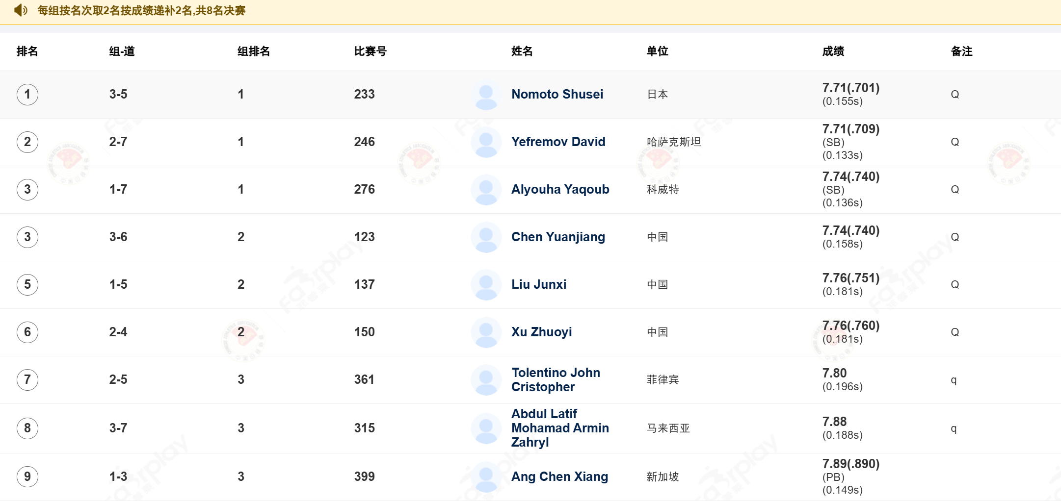 他们的成绩分别为:刘俊茜7秒76(.751)、徐卓一7秒76(.760)、陈圆将7秒74。