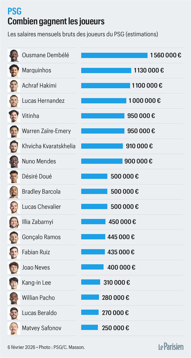 登贝莱和队友薪水依然相当可观,而这些数据还不包括场外收入(赞助费、肖像权费、绩效奖金等)。这位28岁的法国前锋在荣膺金球奖后,是俱乐部薪资最高的球员,据估计,他的月总收入高达156万欧元。