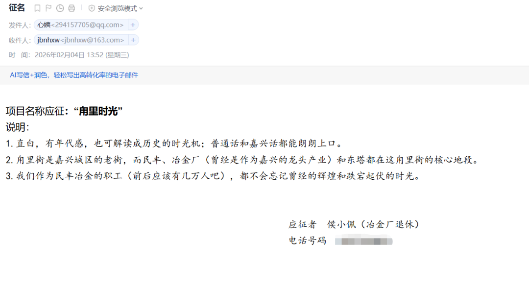 “民丰1923”及配套口号“承百年荣耀,听嘉兴心跳”,以标志性年份定格工业原点,承载着老嘉兴的工业荣光;冶金厂退休职工侯小佩投稿的“甪里时光”,简单四字饱含对冶金厂的青春记忆,质朴而动人;自由撰稿人黄亚兰提出的“冶金时光港”则以“旧厂房藏时光,新科创启华章”的口号,实现了工业记忆与时代新生的巧妙衔接。“民丰里”“冶金里”“百年民丰印巷”等名称,更是以“里”“巷”“港”等字眼,勾勒出老厂区邻里相依的生活气息与工业遗产活化的全新可能。