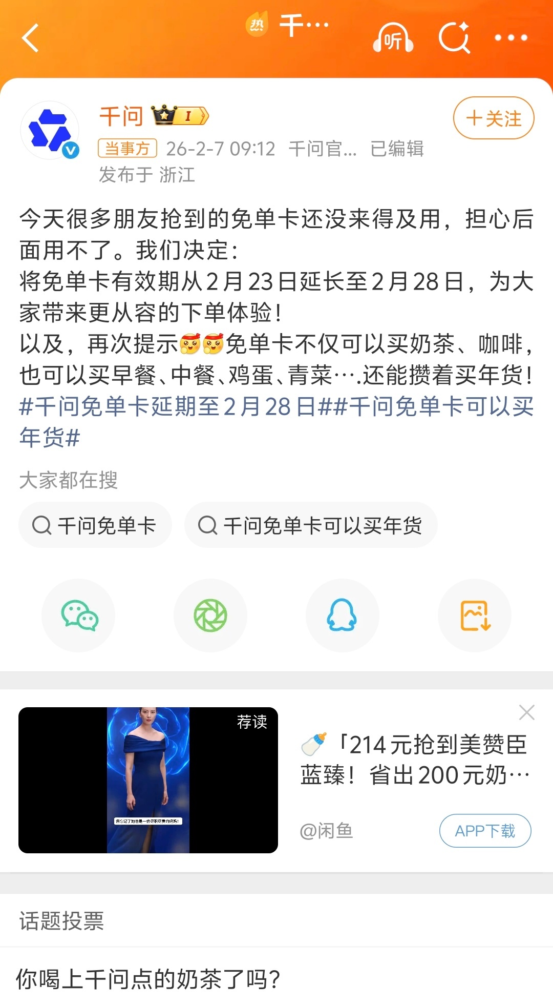 千问 赶紧去冲千问的25元免单卡!不仅可以点外卖,还能在盒马任选生鲜零食、食材,官方生怕你薅不到羊毛,还贴心把有效期延到了28号,快冲!大家截图晒评论区,我随机抽5个幸运观众给25元红包啦
