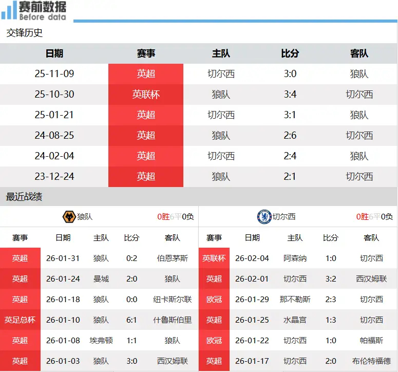 狼队vs切尔西前瞻:蓝军客战副班长 全取三分不在话下北京时间2月7日晚上23时,英超第25轮,副班长狼队主场迎战切尔西。狼队vs切尔西,比赛看点如下:第一:两队情况!英超24轮战罢,狼队1胜5平18负积8分排名第二十垫底,切尔西11胜7平6负积40分排名第五,仅领先第六名利物浦1分,英超争五非常激烈。上轮英超,狼队主场0-2不敌伯恩茅斯,遭遇联赛两连败,连续3轮联赛未能取得进球;切尔西主场3-2击败西汉姆联,豪取各项赛事五连胜,周中联赛杯客场0-1不敌阿森纳,止步半决赛。第二:蓝军客战副班长,全取三分不在话下!切尔西本赛季英超任务就是争夺前五排名获得一个欧冠名额,虽然一周双赛,而狼队是以逸待劳,但切尔西阵容厚度还是很不错的。狼队冬窗还在卖前锋,可以已经接受本赛季英超降级的命运。切尔西遇上副班长,客场就是要争取拿下3分,巩固前五位置,若无法赢球大概率会掉出欧冠区。考虑到两队的排名以及求胜欲望和阵容实力,此役看好蓝军客场擒狼,成功拿到3分。双方近6次交手,狼队2胜4负。双方伤停情况:狼队有阿姆斯特朗、托迪;切尔西有科尔维尔、拉维亚、阿达拉比奥尤、埃苏戈、吉腾斯、詹姆斯(疑)、内托(疑)。