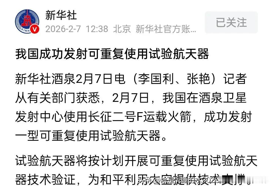 转发分享官网公布的新闻:我国成功发射可重复使用试验航天器! 中国航天2月首发!重量级!! 今天中午,长征二号F/T运载火箭在酒泉成功发射第4艘次的可重复使用试验航天器!该航天器将按计划开展可重复使用试验航天器技术验证,为和平利用太空提供技术支撑。 这是2026年度🇨🇳/全球航天第9/27射!