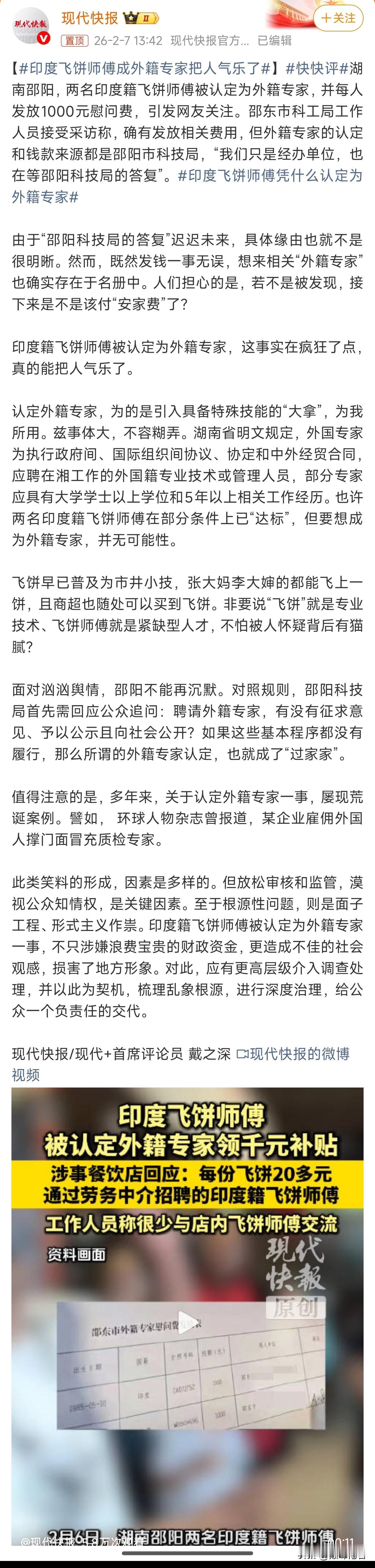 印度飞饼师傅成外籍专家把人气乐了,第一,湖南邵阳把“专家”视作儿戏,把“外籍专家”尤其视作儿戏! 第二,1000块钱虽然不多,但是也是邵阳人民的血汗钱,不是让邵阳这么随便扔给印度做飞饼的厨子的,更何况一扔就是2000块钱。 第三,如果湖南邵阳的钱花不出去,大可以发给邵阳老百姓,一个人发一毛钱,也是政府的关爱,也是老百姓的喜气! 第四,不要动不动见一个“外籍”人士,就高看一眼,甚至是有巴结的姿态出现,很丢人,特别丢中国人的脸!