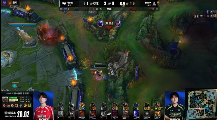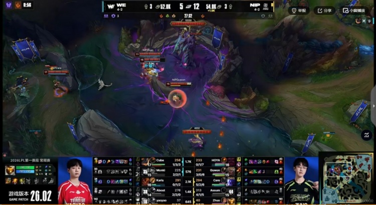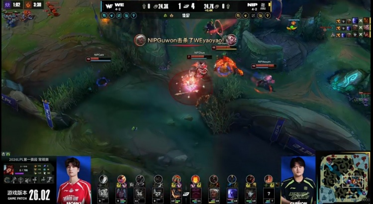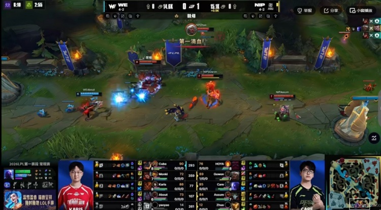 [14:01]WE三人在对手野区强动Care瑞兹,结果被他相位跑掉+Guwon安蓓萨大招拉扯,Assum烬华彩配合队友反打,Care瑞兹开车断后,NIP前后包夹打出0换3!不过随后Care瑞兹换到上路没闪被逮捕,双方互换边路一塔,WE拿下先锋!