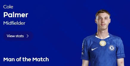 赛后,帕尔默被球迷票选为本场比赛最佳球员,他3次射门全部射正,打进3粒进球,另外在防守端他还贡献了1次解围。