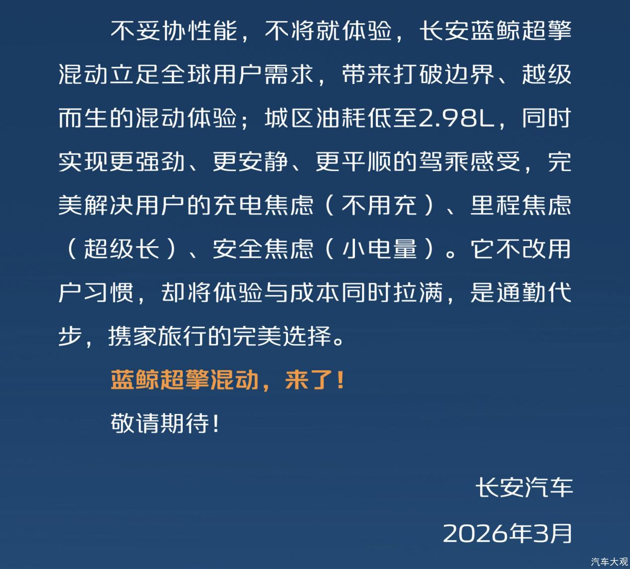 3月12日,长安汽车官方发表《长安蓝鲸超擎混动》宣言,字字铿锵、句句千钧,正式官宣其新一代混动技术名称——“蓝鲸超擎混动”。该技术将在不改变用户习惯的前提下,带来媲美新能源车的出行体验,开启下一个新燃油时代。