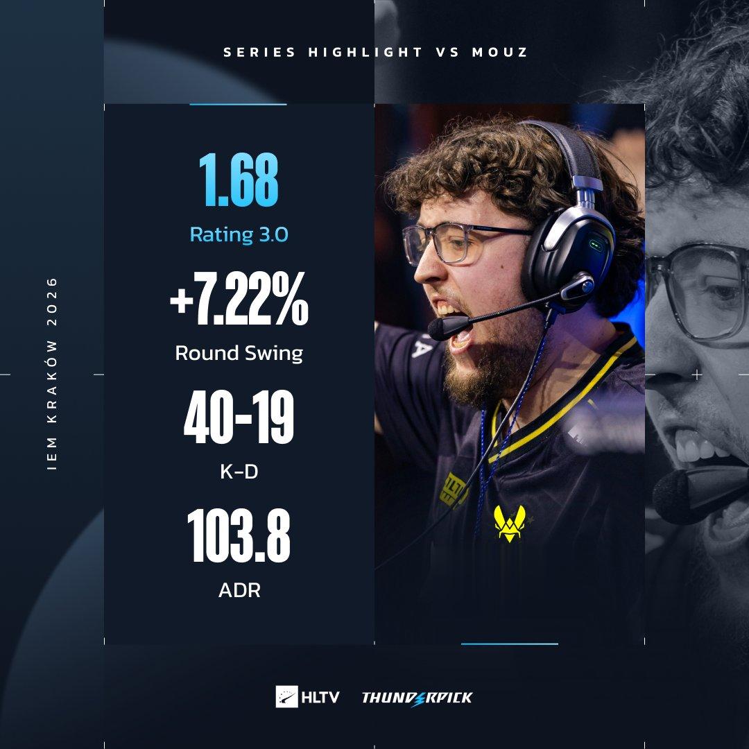 虎扑02月08日讯在IEM克拉科夫2026半决赛对阵MOUZ的关键战役中,Vitality战队核心ZywOo再度展现统治级发挥,整场系列赛中,他打出了惊人的40-19KD,维持了高达103.8的ADR,1.68Rating,以及+7.22%的RoundSwing。无可争议地荣膺系列赛MVP。