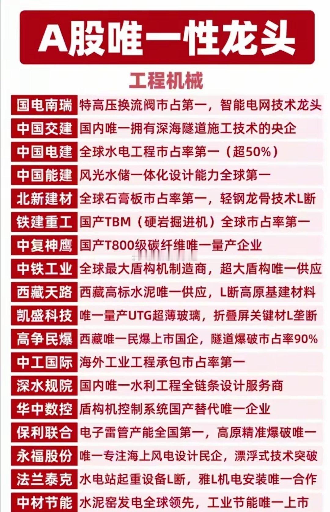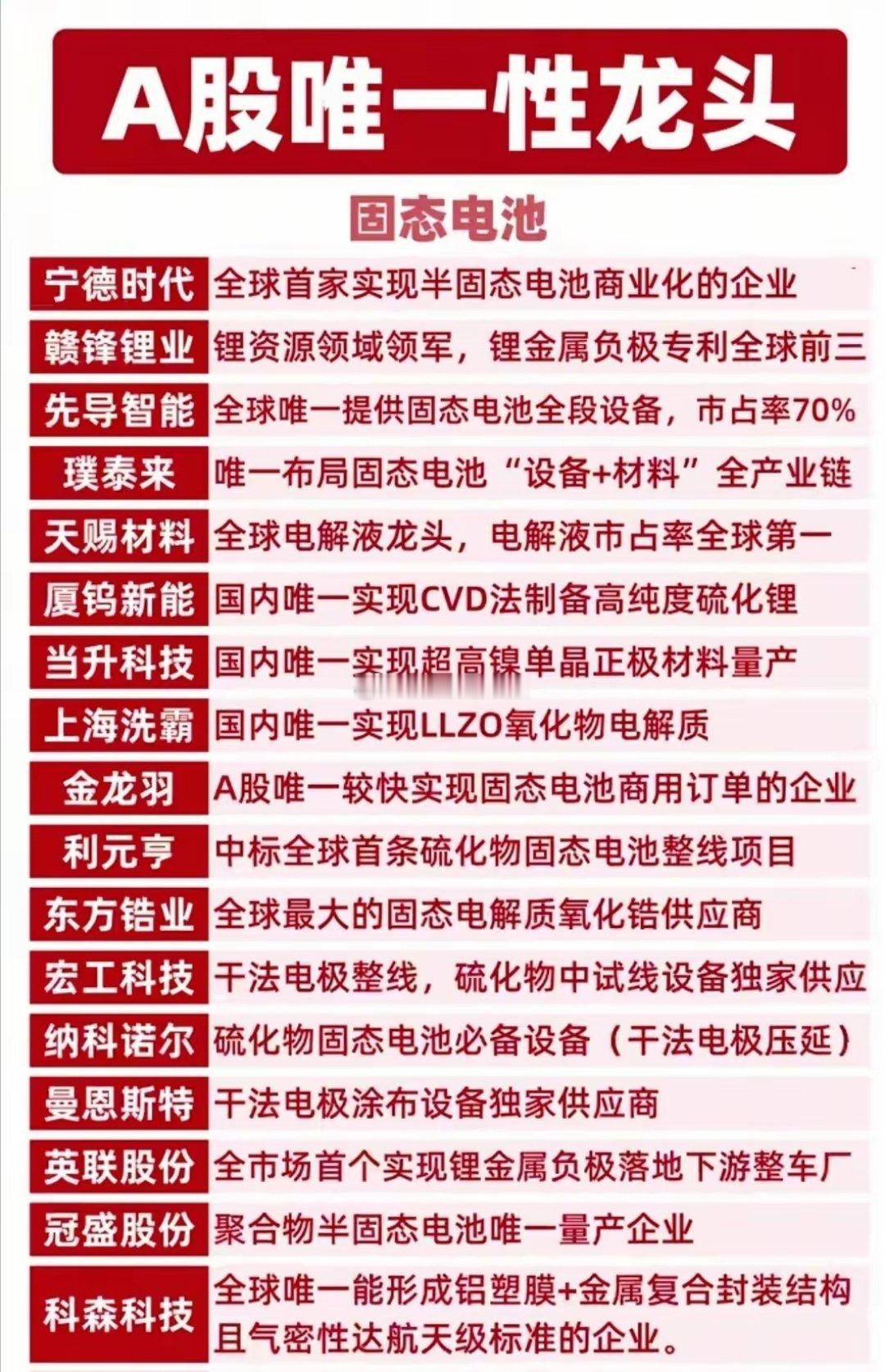 A股唯一性龙头全梳理!核心标的值得硬核收藏!这份名单涵盖能源资源、固态电池、工程