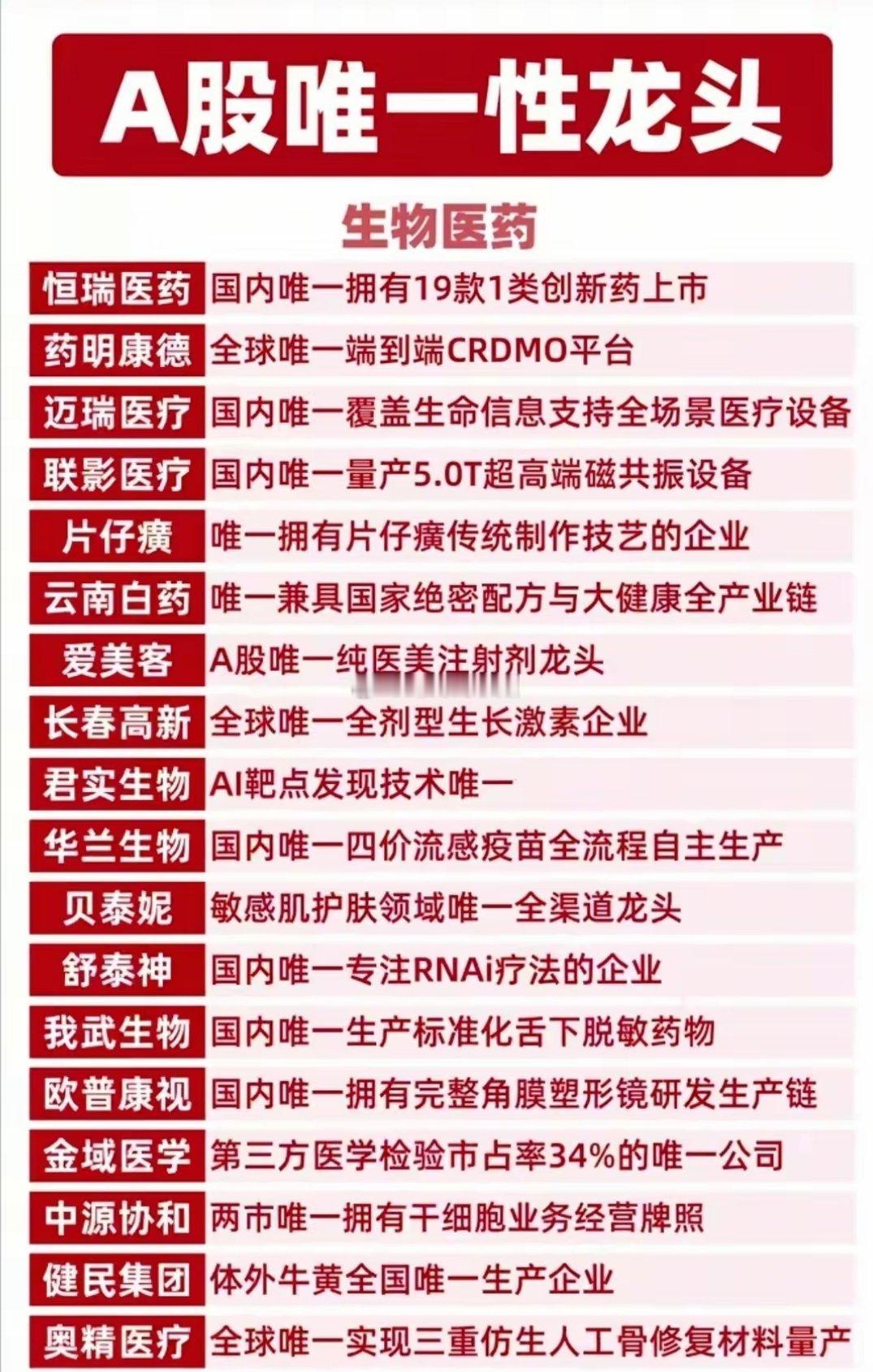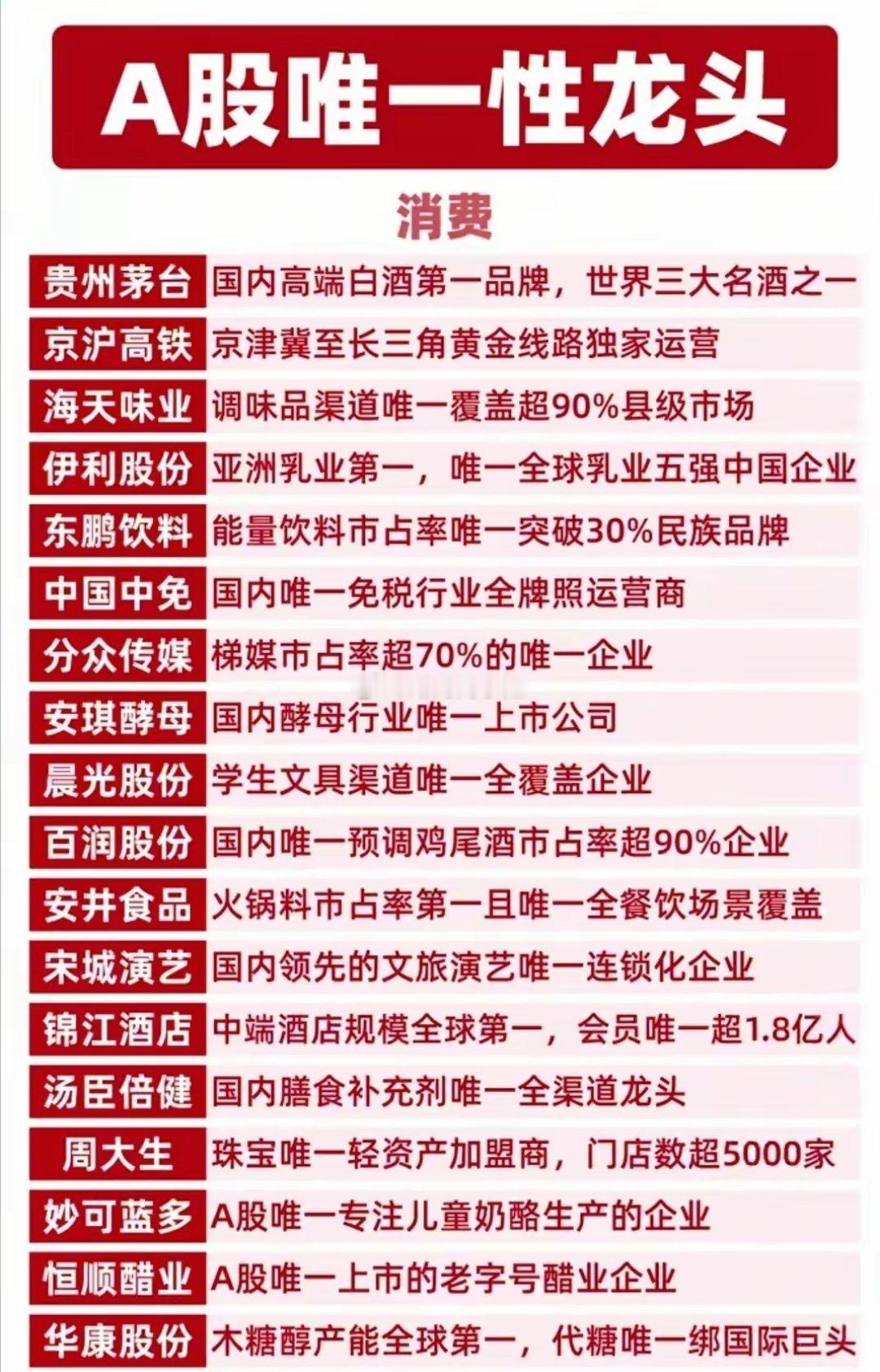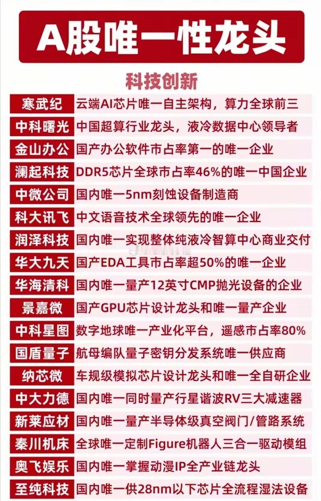 A股唯一性龙头全梳理!核心标的值得硬核收藏!这份名单涵盖能源资源、固态电池、工程机械、文娱、消费、生物医药、科技创新七大核心赛道,挖掘各领域真正具备“唯一性”的龙头企业。硬核逻辑,一眼看懂核心竞争力,赛道龙头,把握产业发展主脉络。这份名单,是你布局A股的硬核参考,建议收藏反复研究!硬核科技叠加唯一性的公司代表:中科曙光、恒瑞医药、科大讯飞、金山办公、华中数控等等。(唯一性不代表股价趋势,资料仅供参考)理财有风险入市需谨慎,资料取材网络仅供参考不能作为投资依据。最后祝您踏准节奏,精准布局选对标的,拿捏行情,财源广进,投资顺利,持仓日日飘红,财源滚滚来!