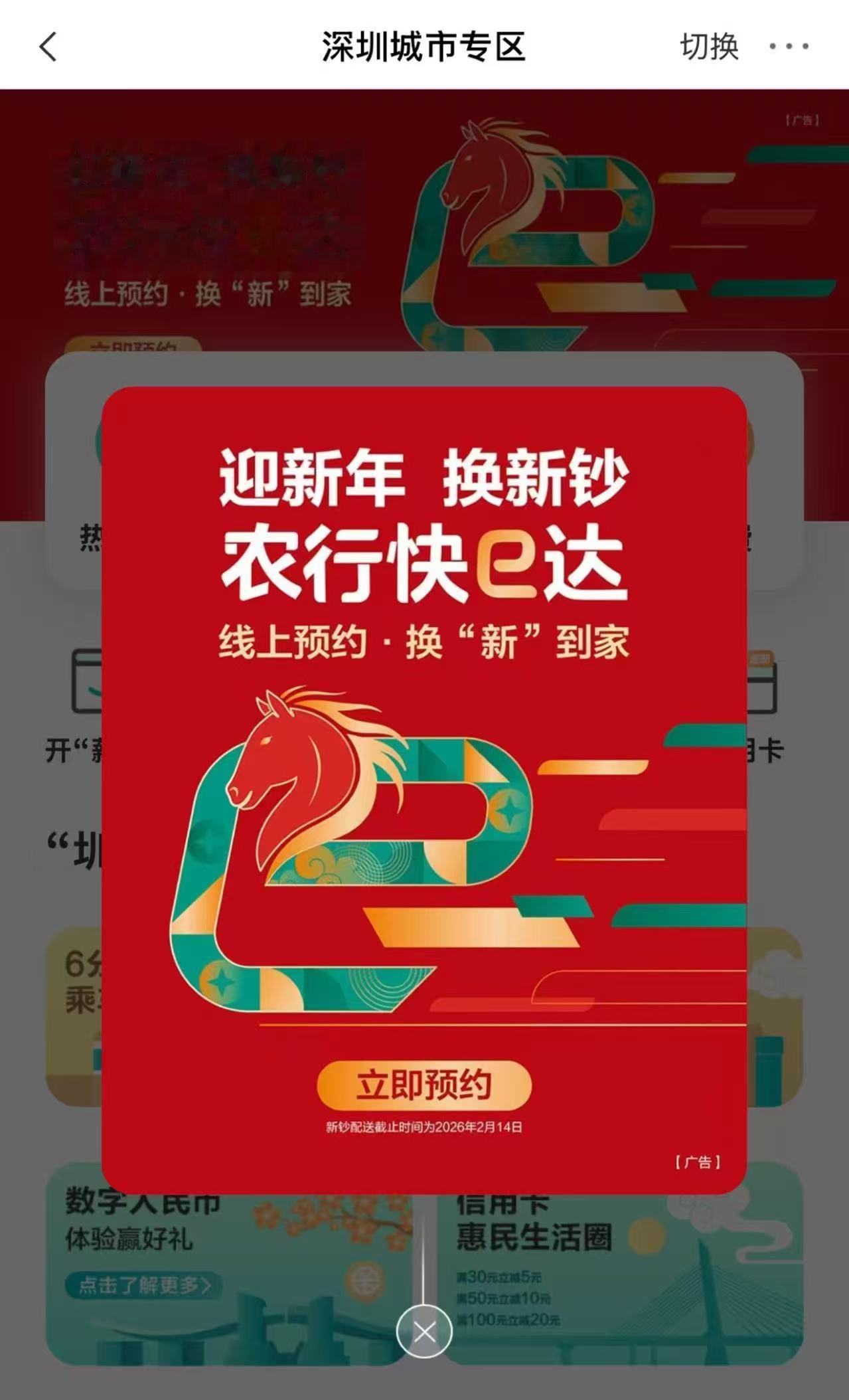 日前,农业银行手机银行APP显示,该行在深圳地区上线了“农行快e达”服务,新钞线上预约,银行负责免费派送到家,配送时间截至2月14日。