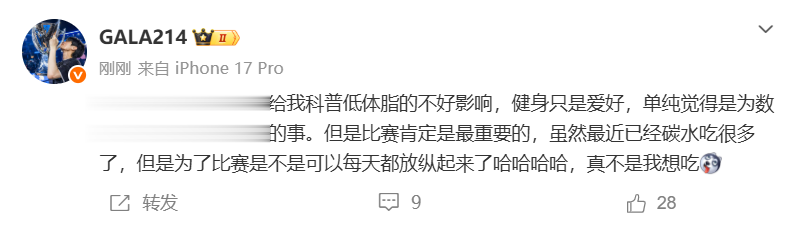 虎扑02月08日讯昨日GALA分享健身照引发热议,今天GALA更新动态进行回应,具体如下: