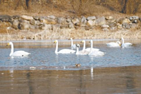 在九渡河镇四渡河村,怀九河环绕村庄流过。“我是去年年初第一次在村里瞅见白天鹅。去年12月下旬,我到村南遛弯时看到这些白天鹅又来了,到现在一共有三四十只。”四渡河村村民唐翠霞说,大伙儿都很喜欢白天鹅,没人愿意惊扰。为了让这些白天鹅在村里更好地生活,有村民找到村委会,建议通过村里的大喇叭提醒大家保护好这些“贵客”。