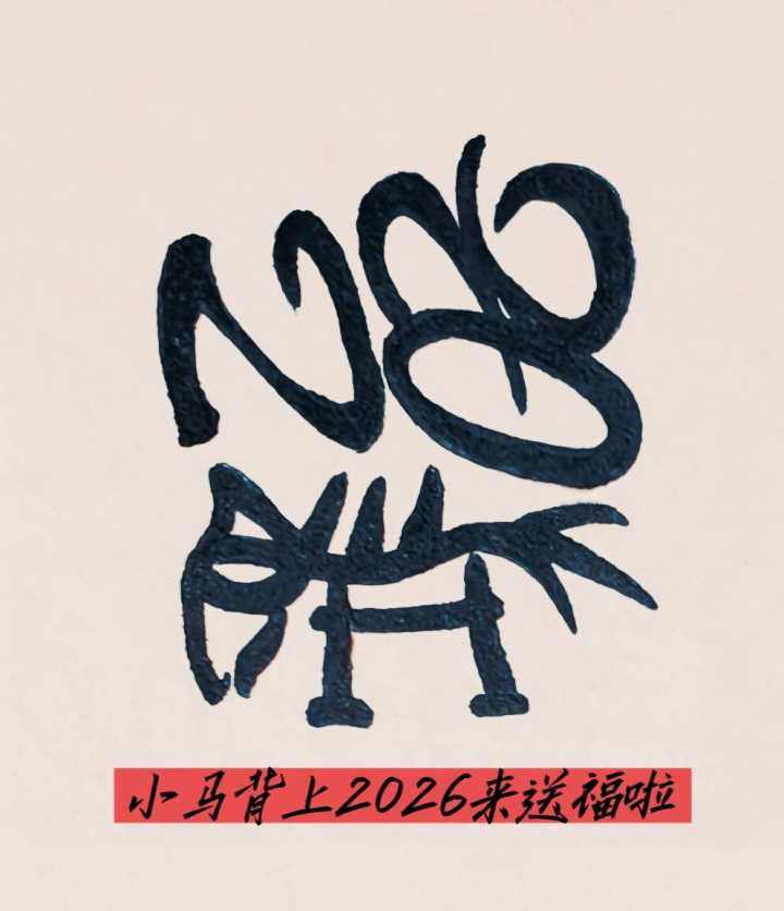 2026来了,陪着孩子一起设计了一个新春“福”字。孩子提出想把甲骨文的马字设计进去,于是这个“福”字的左边旁就设计成了甲骨文的马。那右边该怎么设计呢?这次的马年是2026年,那就把2026设计成福字的右边。好了,我们的新春福字设计完成!远古的小马背上2026给我们送来了最新的祝福~愿大家新的一年身体健康、万事如意、马上有福!