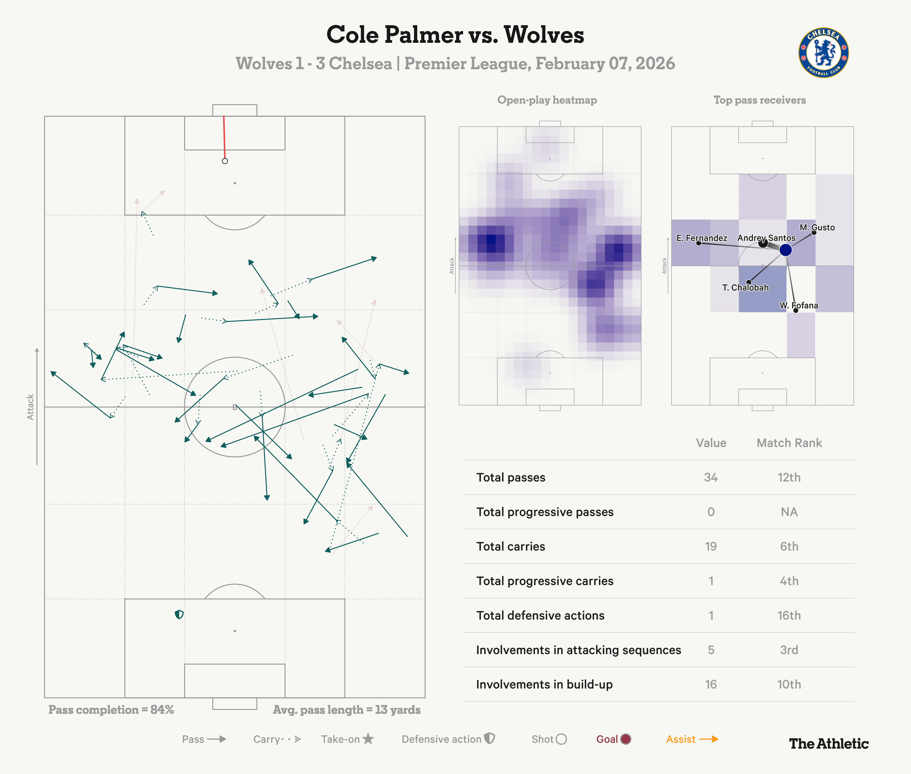 帕尔默的比赛数据看得颇为耐人寻味。我们可以看到,他并没有太多突破或带球进入进攻三区,但即便只出场了61分钟,他在进攻参与度方面仍然位列所有球员第三。