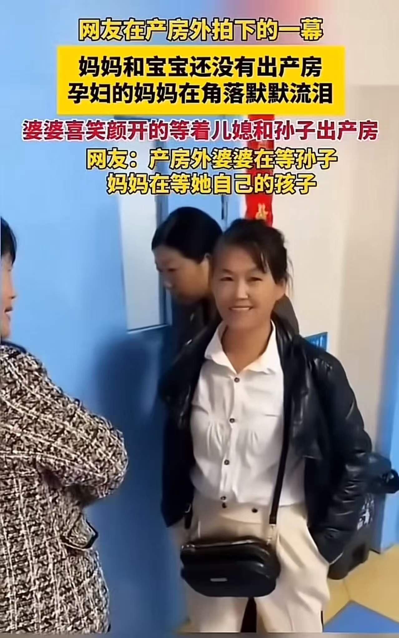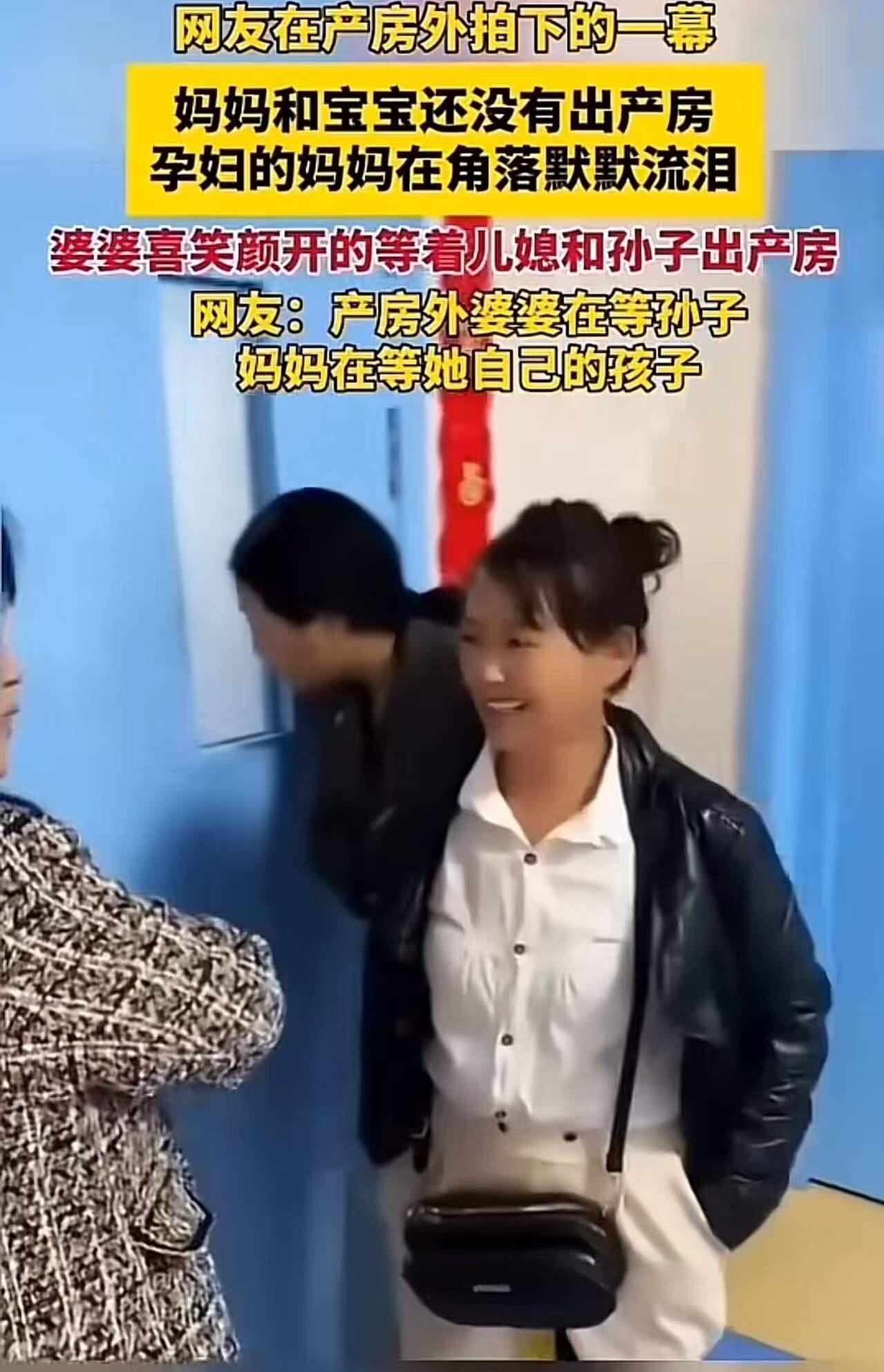 网友在产房外拍下的一幕:妈妈和宝宝还没有出产房,孕妇的妈妈在角落默默流泪,婆婆喜