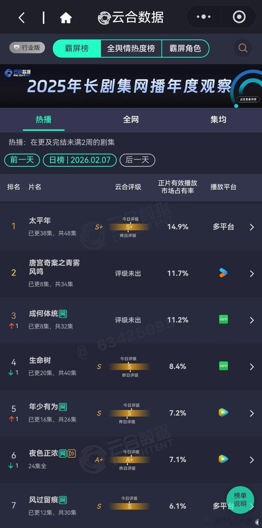 2月6日云合播放占比云合 太平年14.9%没想到太平年还能霸占榜首,多平台的优势出来了。唐宫奇案11.7%涨了些,但也有了横盘趋势。成何体统云合11.2%虽然翻倍失败,但是趋势还是挺好的,小爆趋势挺猛。生命树8.4%生命树 很稳定,看好长尾。风过留痕6.1%评级S,正常水平。
