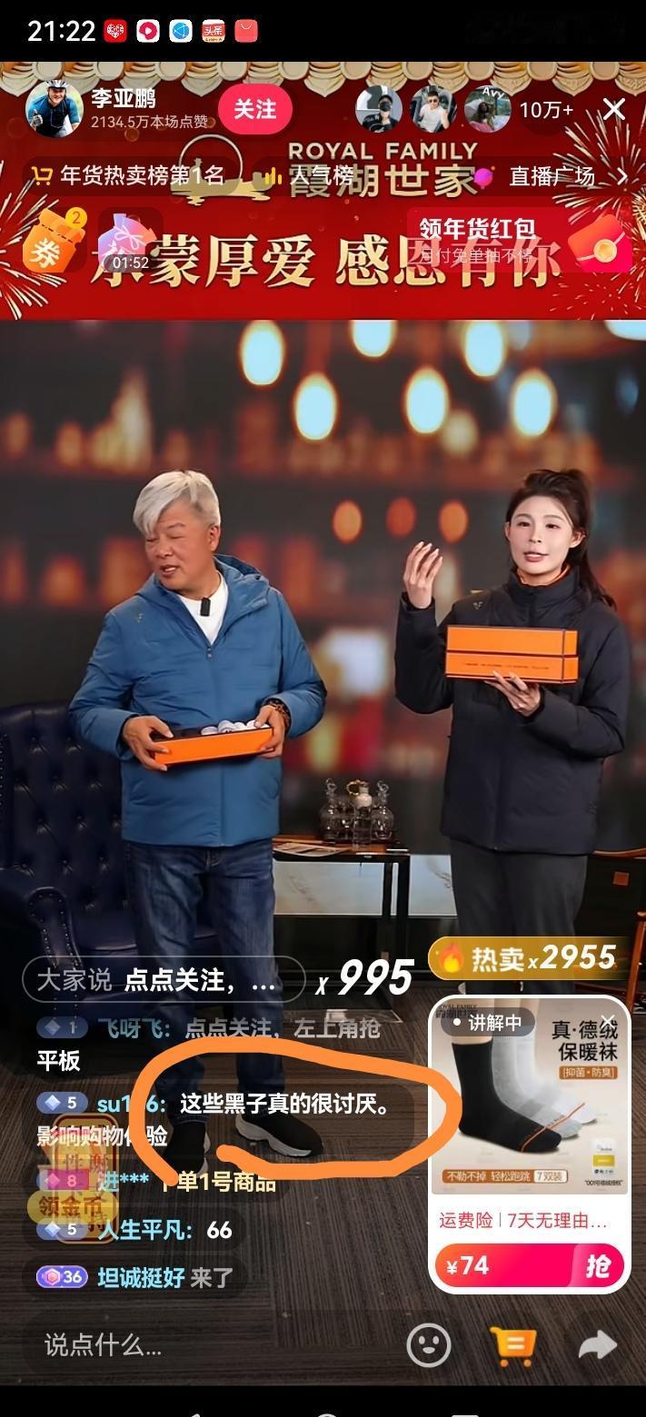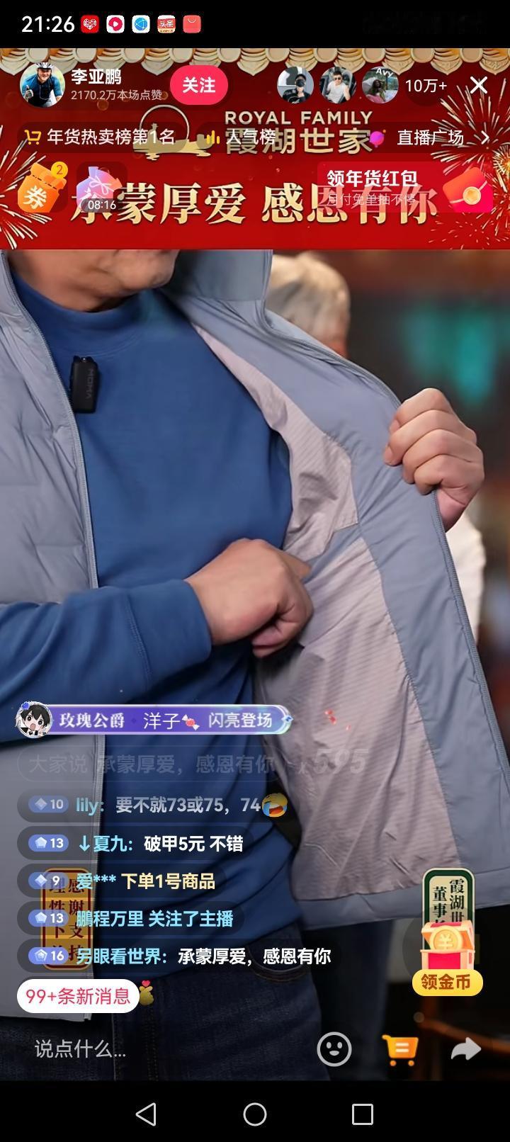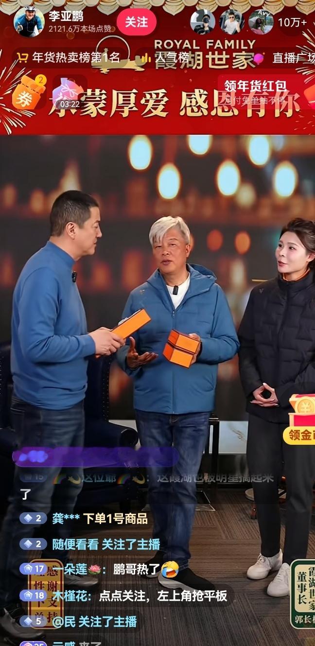 李亚鹏正在直播 卖啥都被抢光 今天是2026年2月8日。晚上9点左右我打开抖音就被推送李亚鹏直播间。 看了一会儿,有几个现象让人很有感慨。 第一,直播间一直人数在10万加,具体是否达到百万加也未可知。 第二,粉丝对李亚鹏的喜爱达到了顶点。一位粉丝说我这个铁公鸡都花了1000多(见图片一)。 第三,粉丝在直播间里表达了对李亚鹏的绝对支持和信任,一位粉丝反复说: 这些喷子很讨厌!(见图片二)。 第四,李亚鹏卖货一直很敬业在推出鹅绒马甲的时候他看到标注的颜色是碧蓝,提出了不同意见,认为标注的颜色有点夸张。 第五,每次推出商品时,李亚鹏都会略微砍个价,砍的并不多也没有像其他商家那样一遍遍的演戏。厂家从不会反驳。 总之这场卖货让人很舒服。 粉丝们之所以在李亚鹏的直播间出手抢购下单,我想99%是由于他的大爱,以及他即使穷困潦倒也。坚持不懈的慈善。 您说是不是呢?