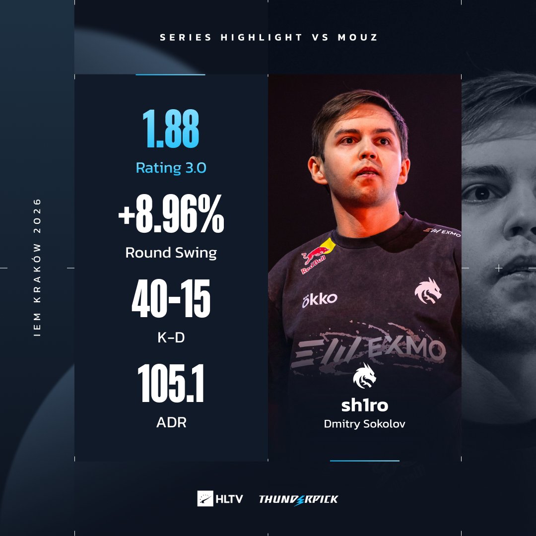 虎扑02月08日讯在刚刚结束的IEM克拉科夫季军赛中,Spirit干净利落2-0横扫MOUZ,成功斩获本届赛事季军。队内明星选手sh1ro打出了40/15的惊人K/D,Rating高达1.88,同时以105.1的ADR持续输出恐怖火力,毫无悬念地荣膺季军赛MVP。