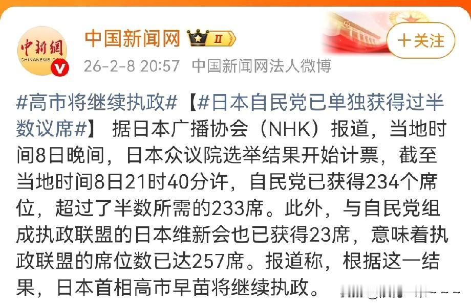 结果出来了! 高市早苗将带领她的内阁继续执政,她现在还没有发表讲话,按理说她是会就日本众议院选举结果发表谈话的,虽然这是日本的内政,但是针对这一结果,我看了一下好多网友的评论,总体评论还是很客观的有“利”有弊,当然这个利是加引号的利就是弊,因为如果高市继续在错误的道路上不回头,势必会把日本带入深渊!这次不下台还有下一次呢。[捂脸]