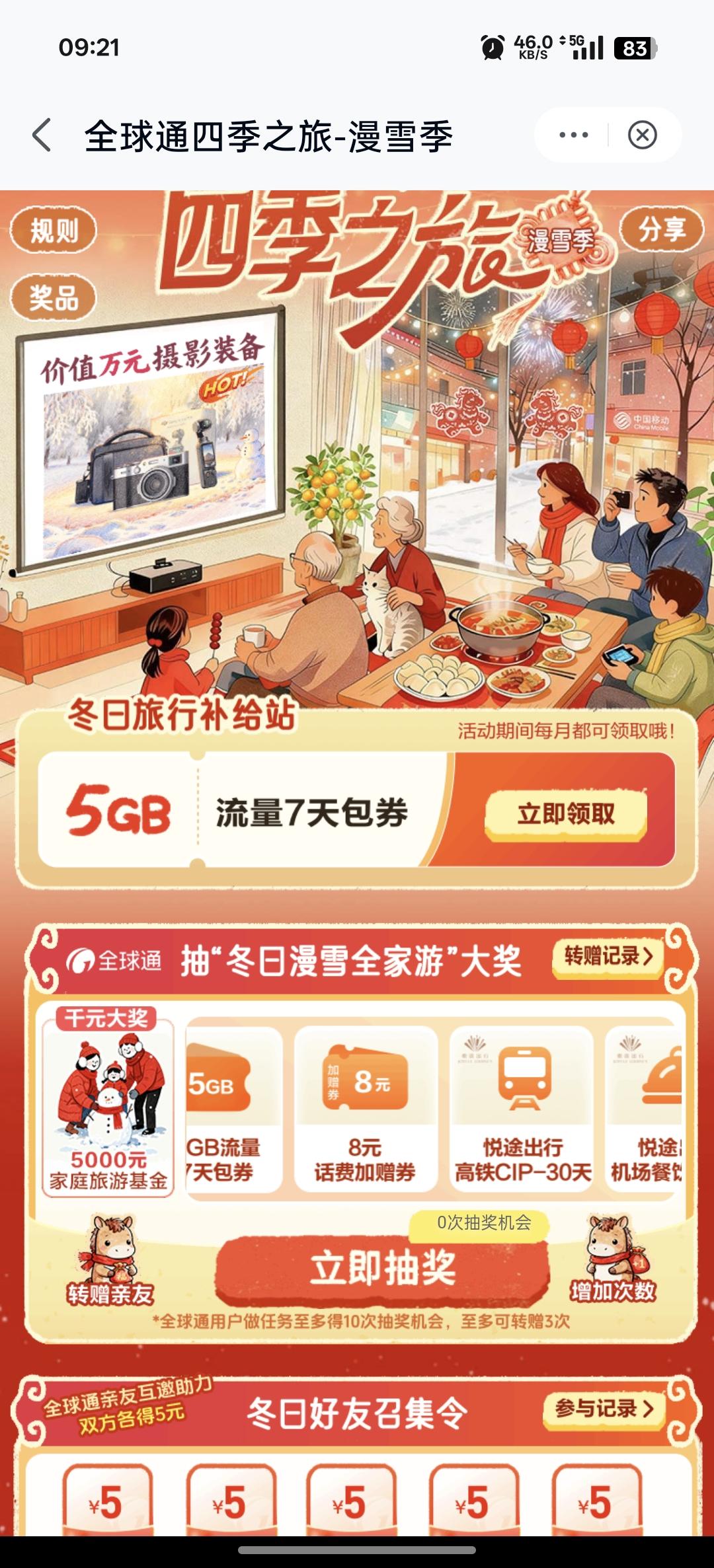 中国移动话费加赠劵、流量劵等等可以领取啦,想领取的朋友可以来看一下。 目前中国移动针对全球通用户开放了流量话费免费抽取活动,奖品包括:2026元话费券、5G流量7天包、8元话费加赠劵、2000元免单机票、家庭旅游基金5000元等等大奖。 我抽到了2张8元话费加赠劵,2张3元话费加赠劵,1张6元话费加赠劵,5GB流量7天包,4GB流量7天包。 这是中国移动给了我们普通老百姓天大的福利,希望大家相互转发让更多亲戚朋友知道,让我们一起薅中国移动的羊毛吧!毕竟以前一直是中国移动薅我们的羊毛[捂脸] 不知道怎么找到活动入口的可以在评论区留言!