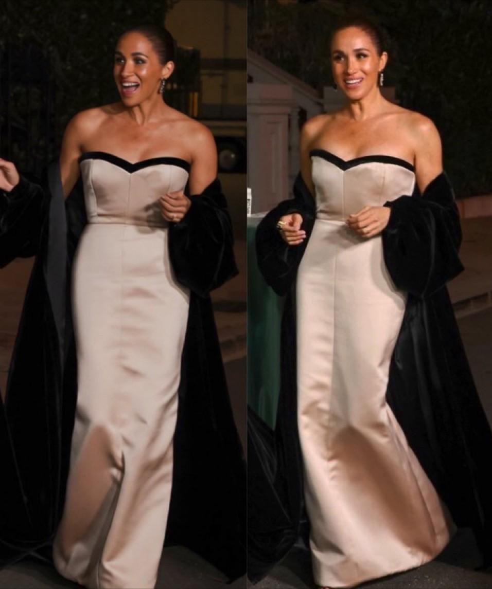 梅根的新照片,这次确实把我惊艳到了! 2月8日,苏塞克斯公爵夫人梅根.马克尔现身洛杉矶,出席了派拉蒙影业公司举行的2026年“百分之十五承诺”筹款晚宴上。 公爵夫人穿着一袭香槟色抹胸礼服,搭配长长的丝绒黑色拖尾斗篷披肩,精致的妆容,身姿婀娜曼妙,尤其是大大的宝石耳坠,整体造型无一不精致贵气。 对比梅根过去的造型,虽然时尚,但是却少了公爵夫人的优雅和贵气。而这次的造型可谓是相当出圈,时尚大气,同时也优雅贵气。 不得不承认,这次的我真是被公爵夫人的新造型美到了,比起优雅著称的凯特王妃,一点不逊色。