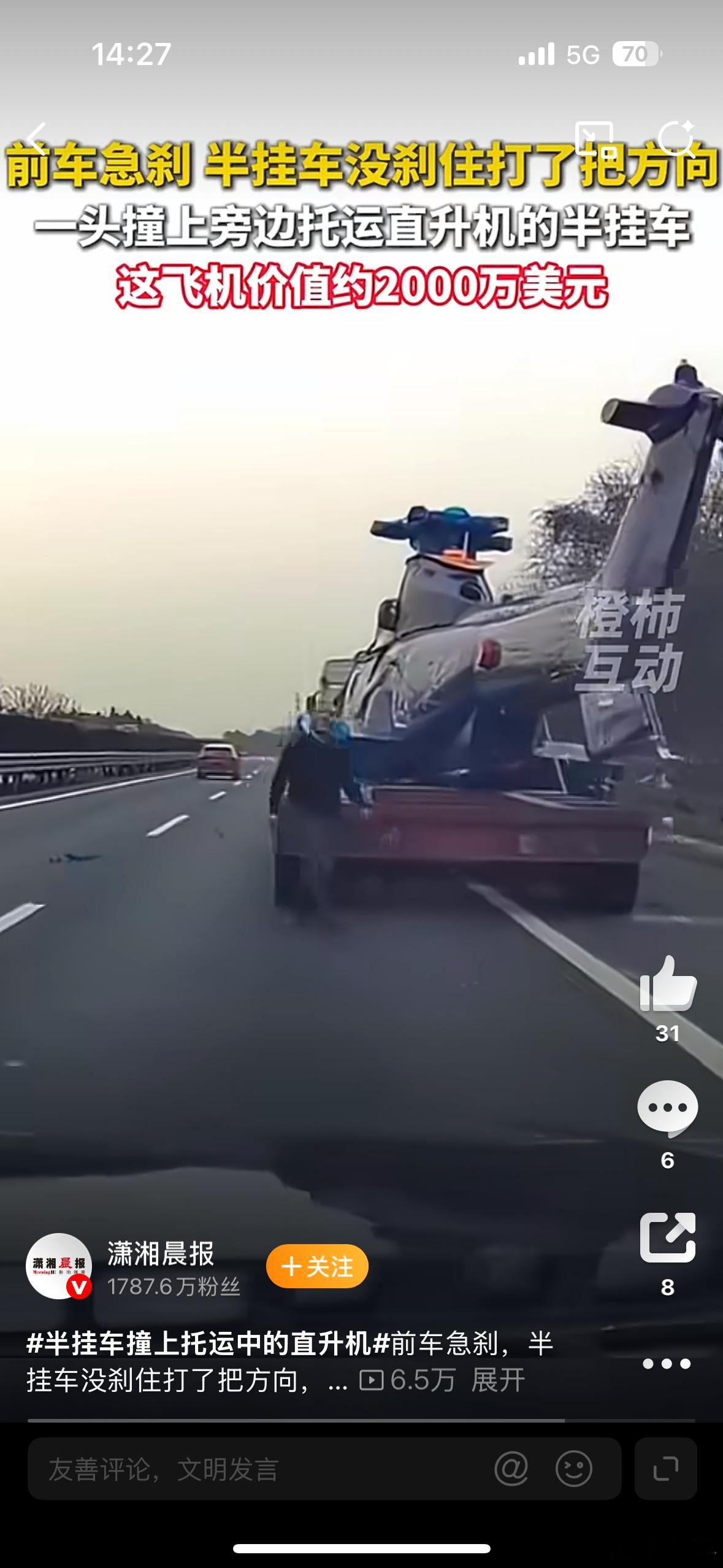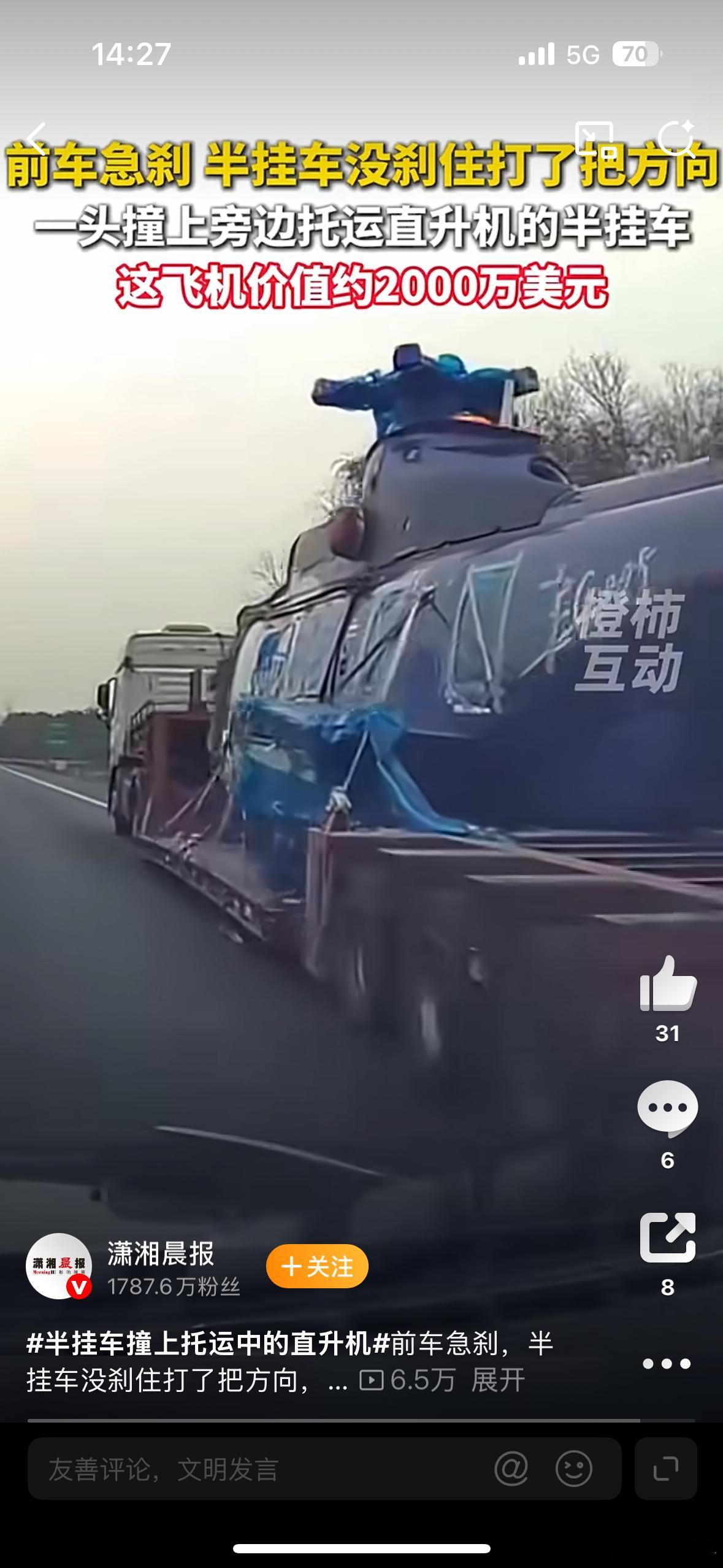 半挂车撞上直升机,全险估计都赔不起,司机这辈子都没想到能出这种事故。近期湖北一
