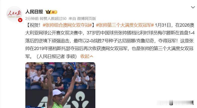 37岁中国金花夺澳网冠军!诞生3个不可思议,看看媒体专家怎么说[送心] 1月31日,墨尔本罗德·拉沃尔球场再次见证了中国网球的荣耀时刻。37岁的中国金花张帅与比利时搭档埃莉斯·梅尔滕斯并肩作战,以7—6、6—4力克跨国组合达尼丽娜/克鲁尼奇,捧起了2026年澳大利亚网球公开赛女双冠军奖杯。 这是张帅职业生涯的第三座大满贯双打冠军,距离她上一次在澳网夺冠,已经过去了整整七年。 决赛的进程完美诠释了何谓“老兵不死”,首盘比赛,张帅组合开局不利,一度以1—4落后。关键时刻,丰富的经验与强大的心理素质成为转折点。张帅甚至在局间休息时安慰搭档说,“比0—5落后好多了。” 她们硬是将比赛拖入抢七,并稳稳拿下。 第二盘剧本同样曲折,在5—0领先的大好局面下,她们被对手连追四局,但最终仍在第三个发球胜赛局锁定胜局。这场胜利为她们带来了81万澳元的冠军奖金。 这座奖杯的重量,远超其物理意义。对于张帅而言,这是一段跨越漫长低谷后的王者归来。许多球迷或许还记得,在2023年至2024年期间,张帅曾遭遇单打赛场跨赛季24连败的至暗时刻,世界排名一度跌至700名开外。 她曾坦言,那段时期几乎每周都在输球,甚至开始怀疑自己是否已被顶级赛场淘汰。人情冷暖也随之而来,曾经主动寻求合作的球员,开始对她冷淡甚至拒绝。 然而,正是从这样的绝境中,张帅凭借在ITF赛场的38场胜利一步步爬回Top100,并在2024年美网重返大满贯女双决赛,最终在本届澳网登顶。 赛后,张帅身披国旗,与梅尔滕斯紧紧相拥,激动落泪。她在致辞中动情地说,“感谢梅尔滕斯最后时刻答应我,我们是十二月很晚时才确定要一起搭档的。” 这是一对充满默契的“临时组合”,上次携手还要追溯到2022年温网,当时她们便获得了亚军。 而此次为她颁发冠军奖杯的,正是她2019年首夺澳网冠军时的老搭档萨曼莎·斯托瑟。张帅哽咽道,“我的三个大满贯,你都在现场。” 现场还有另一位中国网坛的功勋人物,2006年在此为中国赢得首个大满贯的郑洁。这场胜利,是一次跨越二十年的致敬与传承。 以37岁“高龄”夺冠,张帅就此创造了历史,她成为公开赛年代以来,澳网最年长的亚洲女双冠军。她的职业生涯就是一部励志史诗,17岁转入职业,曾遭遇大满贯单打14次“一轮游”的魔咒,在2016年澳网才取得突破。 如今,她5次闯入大满贯女双决赛,收获3冠2亚,成为了中国大陆获得大满贯双打冠军最多的球员。