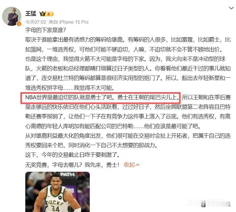 和平分手!字母哥结束雄鹿生涯!苏群王猛发声,勇士7换1极限报价[送心] 2月9日,NBA交易截止日的大幕已经落下三天,但关于扬尼斯·阿德托昆博的转会风暴,远未平息。与之前“和平分手”的喧嚣不同,现实剧情出现了巨大反转。 雄鹿队已正式通知联盟各队,字母哥在本次截止日前不会被交易。这意味着,之前所有关于他即将改换门庭的狂热讨论,在截止日时钟归零的那一刻,暂时画上了休止符。 过去几个月,金州勇士队被视为最积极的追求者。记者布雷特·西格尔在2月4日披露,勇士曾提出一份极具震撼力的报价,送出乔纳森·库明加、安德鲁·巴特勒、布兰丁·波杰姆斯基四名年轻球员,外加四个首轮选秀权和两个首轮互换权。这几乎是一次对未来的全盘押注。 然而,雄鹿管理层多次拒绝了这份诚意十足的报价。意识到无法在截止日前得到字母哥后,勇士迅速转向,用库明加和巴迪·希尔德从老鹰换来了克里斯塔普斯·波尔津吉斯,并做了其他边缘调整。他们的“B计划”已经启动。 不仅勇士,其他热门下家如热火和森林狼也积极追逐。有消息称,字母哥本人曾将森林狼视为理想目的地,期待与安东尼·爱德华兹联手,森林狼也愿意拿出麦克丹尼尔斯、里德等优质资产。但最终,这些努力都未能打动雄鹿。 那么,雄鹿到底意欲何为?NBA记者Fischer曝出的内幕令人玩味:有与雄鹿谈判过的高管认为,球队从一开始就没有真心想交易字母哥,更多是在“套报价、看行情”。这出持续半年的交易大戏,可能只是雄鹿管理层的战略试探。 雄鹿的底气或许来自巨大的经济杠杆,从今年10月1日开始,字母哥有资格签下一份4年价值2.75亿美元的超级顶薪合同。如果他在休赛期被交易,则需要等待6个月才能签下这份天价合约,其间充满伤病等不确定性风险。留在雄鹿,则能最安全、最快地锁定这份历史级薪水。 对于即将32岁的字母哥而言,这个选择不难理解。他在密尔沃基已经赢得了一切:总冠军、总决赛MVP、两次常规赛MVP,以及队史几乎所有的数据纪录。在金钱有保障的前提下, “一人一城”的传奇故事依然有吸引力。 雄鹿本赛季战绩挣扎,位列东部前十开外,这是所有流言的起点。管理层承诺的补强必须在休赛期兑现,否则字母哥的离队意愿很可能在夏天再次爆发。届时,湖人等拥有大量薪资空间和选秀权的球队将加入战局。 这场震动联盟的转会风波,暂时以“留守”告一段落。但它深刻地揭示了现代NBA巨星交易的复杂性,不仅是筹码的比拼,更是心理的博弈、经济的计算和未来规划的权衡。雄鹿用一场“虚晃一枪”保住了他们的旗帜,但也把更大的悬念和压力,留给了这个夏天。