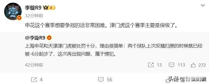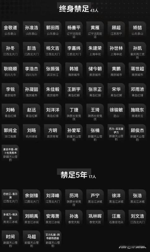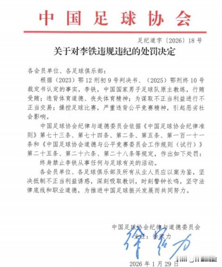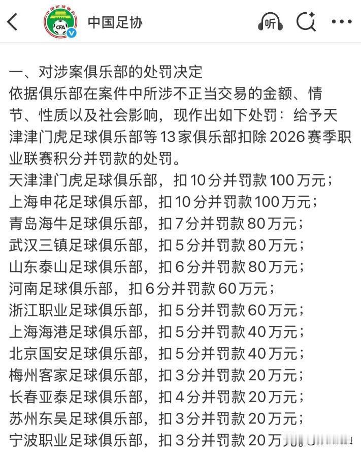 来了!中超9队被扣分,申花最多!两批136人禁足,李铁再遭处罚![送心] 中国足坛的震荡在去年1月29日达到了一个标志性的节点,这一天,公安部、国家体育总局与中国足协联合召开专题会议,向社会公布了足球行业“假赌黑”问题专项整治工作的严厉处罚结果。 这次处理不仅涉及面广,其力度也堪称空前,核心围绕两大措施:对多家俱乐部的联赛扣分处罚,以及对大量从业者的行业禁入处罚。 扣分处罚直接改写了新赛季的竞争格局,中超联赛共有九家俱乐部受到波及,超过联赛半数。其中,上海申花与天津津门虎均被扣除10个联赛积分,处罚最重。青岛海牛被扣7分,山东泰山与河南队各被扣6分。 上海海港、北京国安、浙江队及武汉三镇四家俱乐部则各自被扣5分。此外,已降至中甲的长春亚泰和梅州客家也分别被扣除4分和3分。综合计算,上赛季的中超联赛中,实际存在违规行为的俱乐部达到了11家之多。 这一纸罚单让即将在3月1日开幕的新赛季中超充满了变数,原本被视为夺冠热门的上海申花,新赛季尚未开战便已“负重”10分,争冠前景陡然变得异常艰难。天津津门虎则需要在巨大的保级压力下开启征程。 传统强队中唯一“全身而退”的成都蓉城,瞬间被视为冠军的有力争夺者。联赛的竞争天平在开赛前就已发生了剧烈倾斜。 如果说扣分震撼了俱乐部层面,那么同期公布的人员处罚名单则触及了行业个体的根本。中国足协依据司法判决和调查结果,对相关人员给予了行业资格处罚。 其中,73人被处以终身禁足,另有3人被禁足5年。这份名单堪称一份令人扼腕的“名人录”,前中国足协主席陈戌源、前国家体育总局副局长杜兆才、前国足主帅李铁、前足协秘书长刘奕、常务副秘书长陈永亮等核心涉案人员均名列其中。 尤其值得注意的是李铁的情况,他此前因受贿、行贿等罪名被依法判处有期徒刑。此次行业处罚意味着,即便未来刑满释放,他也将被永久隔绝在足球行业的大门之外。 名单中还包含许多球迷熟悉的名字,如前国门张鹭、球员时期的秦升、曾执教山东泰山的郝伟等。他们的职业生涯因触及红线而彻底画上句号。 这次从2022年底席卷而来的足球反腐风暴,至此给出了一个阶段性的、严厉的答案。它清晰地传达出一个信号,无论地位多高、名气多大,只要触碰“假赌黑”的红线,都将面临司法与行业的双重严惩。 对于球迷和行业观察者而言,这份沉重的处罚清单固然带来了短期的阵痛与震撼,比如联赛竞争格局的非常态变化,但它更代表了一次刮骨疗毒。将系统性脓疮彻底清除,是行业重建健康肌体的痛苦却必要的前提。 新赛季的中,超定将在这种前所未有的背景下启航。扣分球队如何调整心态,在积分落后的逆境中激发更强的战斗力?未受处罚的球队能否抓住机遇,重塑联赛秩序?上海申花在引进强援后,能否上演惊人的逆袭故事?