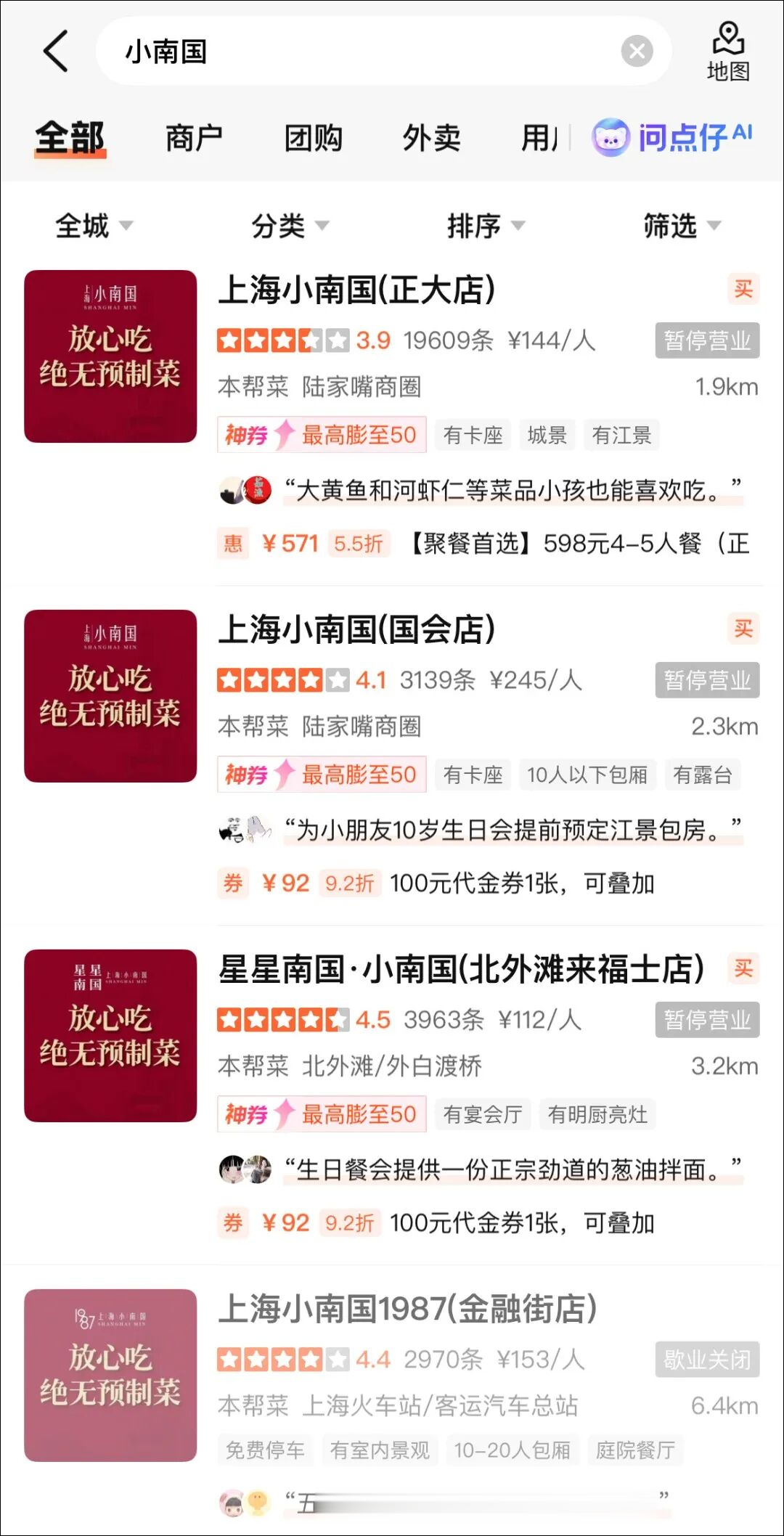 大众点评上显示,多家小南国已停业。
