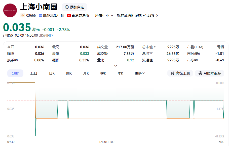 2月9日,上海小南国盘中一度下跌8.33%,截至收盘,该股跌幅为2.78%,报0.035港元/股。