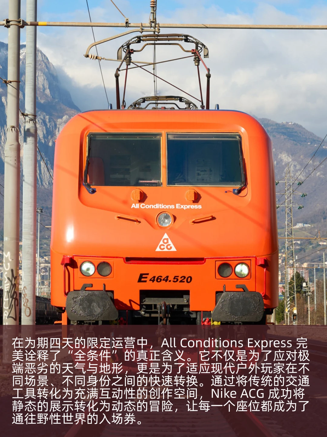 在为期四天的限定运营中,All Conditions Express 完美诠释了“全条件”的真正含义。它不仅是为了应对极端恶劣的天气与地形,更是为了适应现代户外玩家在不同场景、不同身份之间的快速转换。通过将传统的交通工具转化为充满互动性的创作空间,Nike ACG 成功将静态的展示转化为动态的冒险,让每一个座位都成为了通往野性世界的入场券。