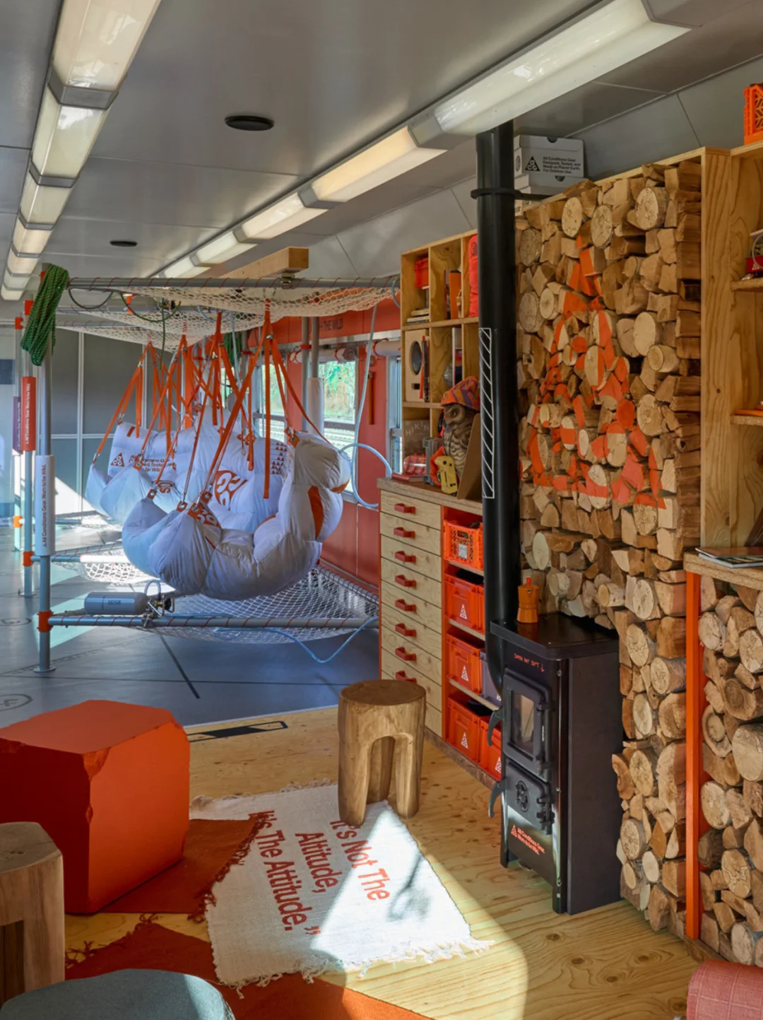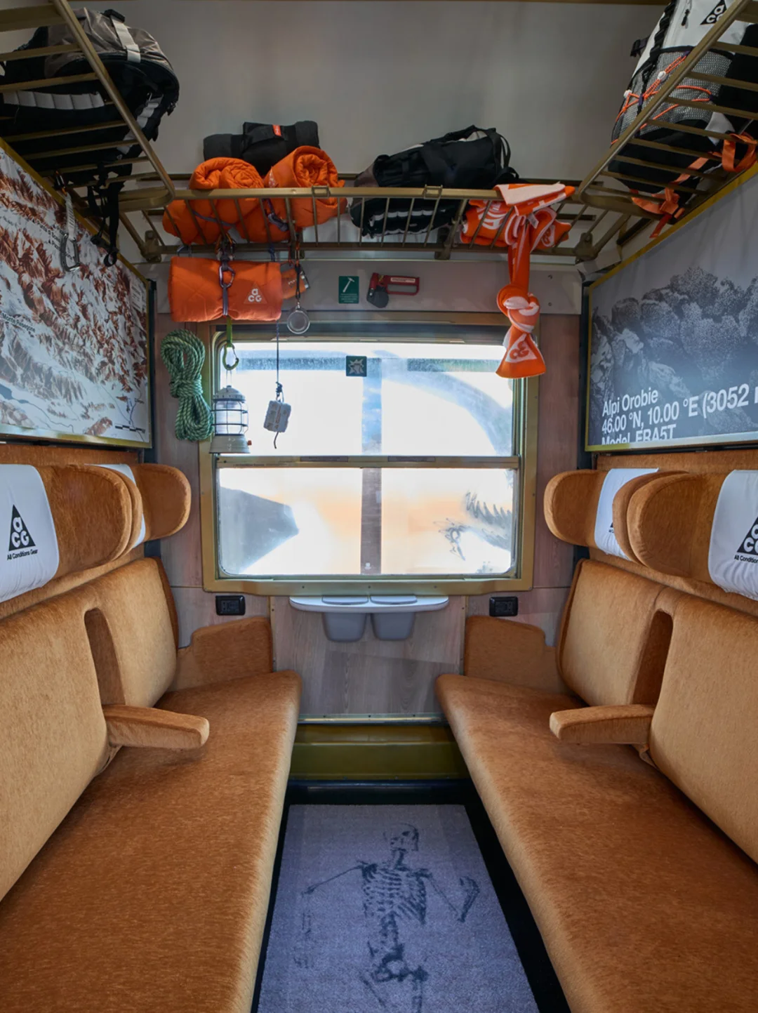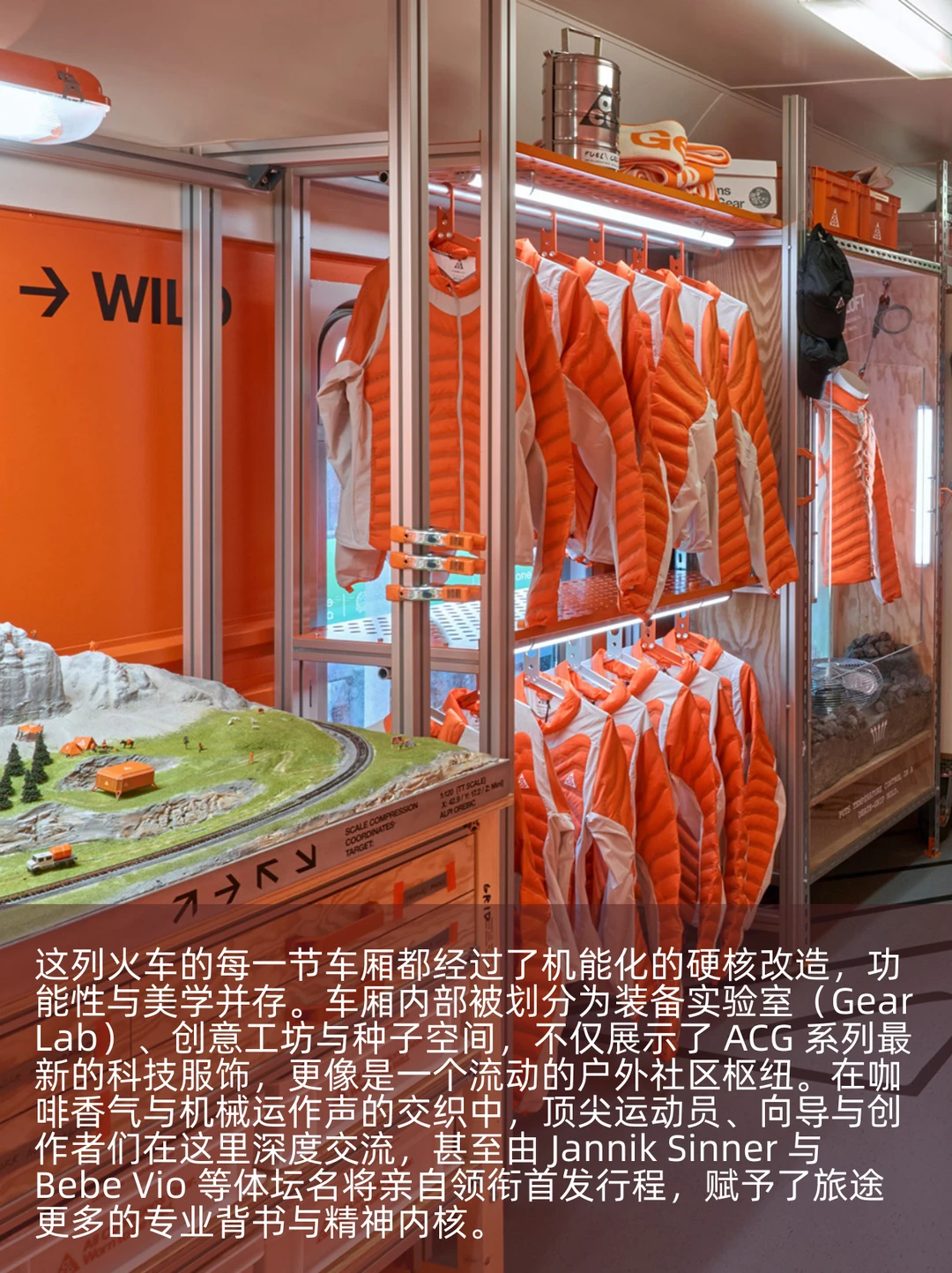 这列火车的每一节车厢都经过了机能化的硬核改造,功能性与美学并存。车厢内部被划分为装备实验室(Gear Lab)、创意工坊与种子空间,不仅展示了 ACG 系列最新的科技服饰,更像是一个流动的户外社区枢纽。在咖啡香气与机械运作声的交织中,顶尖运动员、向导与创作者们在这里深度交流,甚至由 Jannik Sinner 与 Bebe Vio 等体坛名将亲自领衔首发行程,赋予了旅途更多的专业背书与精神内核。