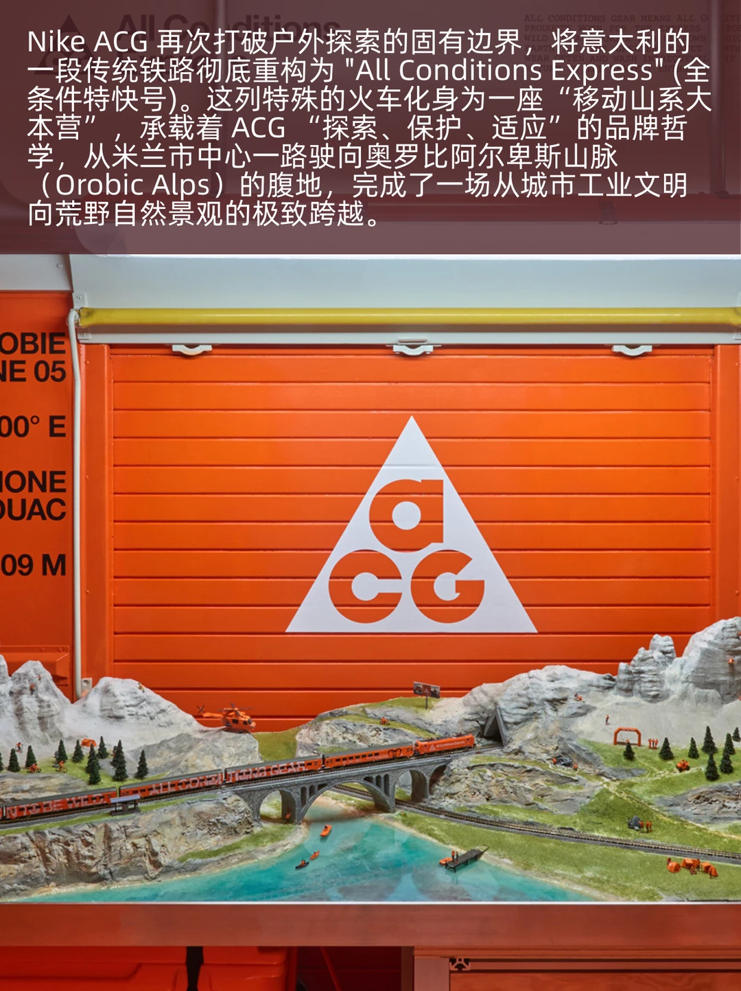 Nike ACG 再次打破户外探索的固有边界,将意大利的一段传统铁路彻底重构为 "All Conditions Express" (全条件特快号)。这列特殊的火车化身为一座“移动山系大本营”,承载着 ACG “探索、保护、适应”的品牌哲学,从米兰市中心一路驶向奥罗比阿尔卑斯山脉(Orobic Alps)的腹地,完成了一场从城市工业文明向荒野自然景观的极致跨越。