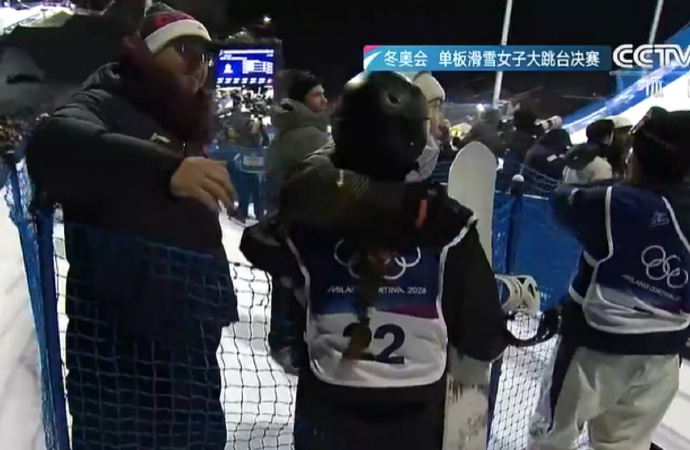 赛后出现暖心一幕:同为中国单板滑雪名将的苏翊鸣专程到场为她助威,并在比赛结束后第一时间与她拥抱致意。