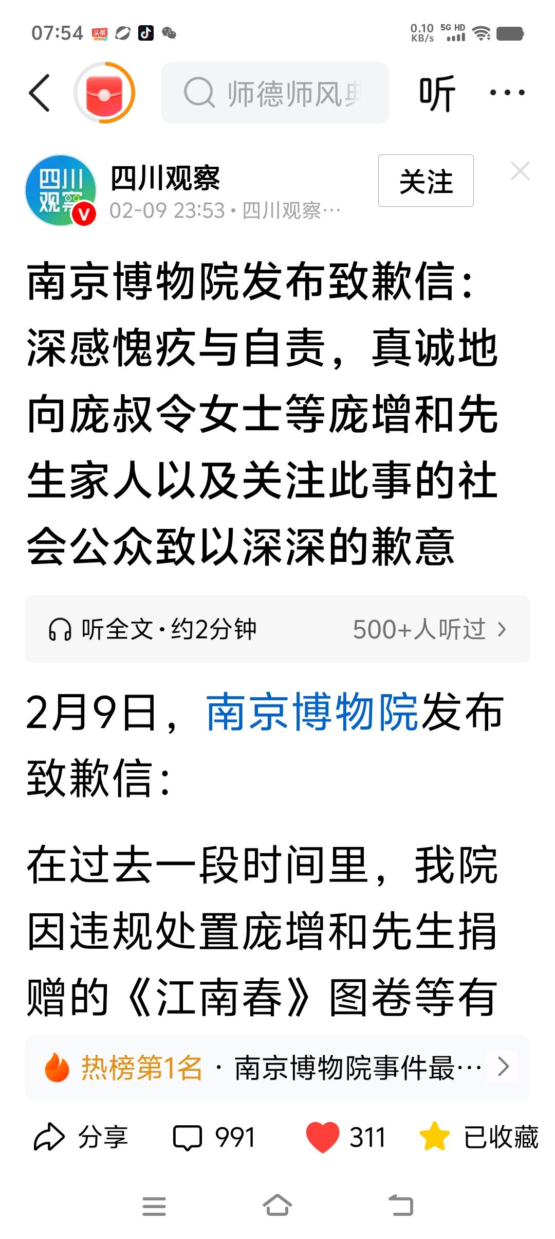 南博世界终于有了回应: 目前庞家捐赠到江南春等五幅字画藏品,已经追回4幅: 1、《江南春》图卷 2、《仿北苑山水轴》 3、《双马图轴》 4、《设色山水轴》 4幅画作,经追溯调查、经手人证明、专家查验、加强司法鉴定核实,确认是庞增和捐赠的画作。 经分别与《江南春》图卷、《仿北苑山水轴》、《双马图轴》有关权利人依法依规协商,这3幅画作已交由南博收藏。 仅剩《松风萧寺图轴》这一藏品没有追回,但也正在全力循线追查! 南博向捐赠字画的庞家以及关注国家文物保护工作的人发了公开致歉信! 此事件涉及29人,其中5人离世,其它24接受审查处理! 原馆长徐湖平徐湖平还涉嫌其他严重违纪违法问题,目前正接受纪检监察机关纪律审查和监察调查。