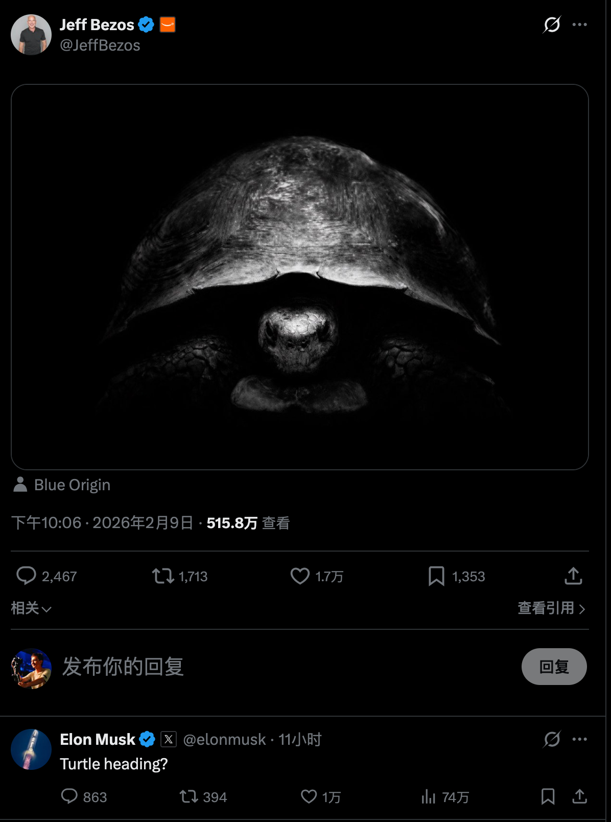 这张没有任何文字说明的配图,在航天圈炸响了一声惊雷。此时正值马斯克高调宣布, SpaceX 将战略重心从火星暂时转回月球,计划建设月球城。这张乌龟图背后的潜台词呼之欲出:蓝色起源(Blue Origin)才是那只终将胜出的乌龟,而 SpaceX 是那只虽然跑得快、却随时可能因为分心而打盹的兔子。