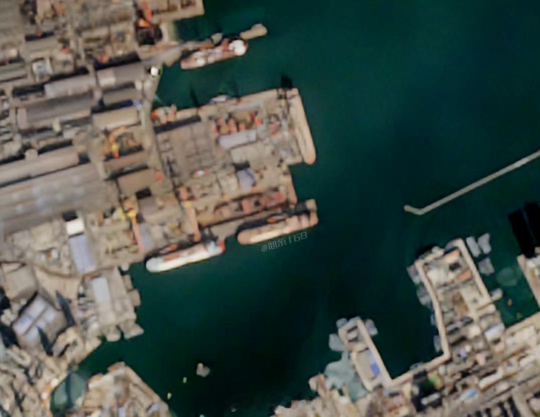 昨天的004卫星图 龙门吊从船坞前方的堆料区吊起模块了,建造进度极快 图源见水印