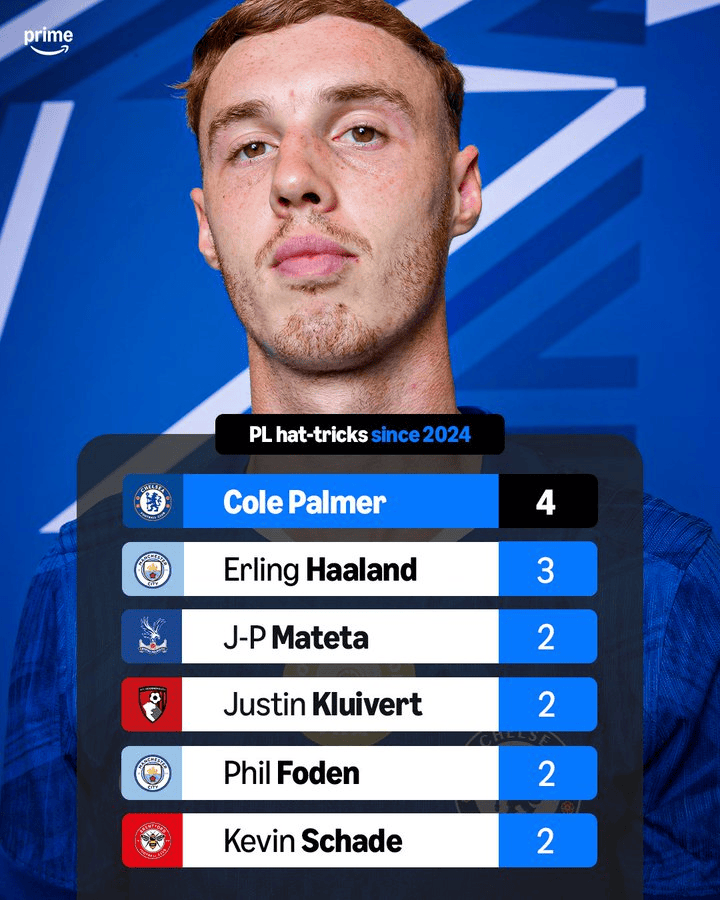 4次!自2024年初以来,帕尔默是英超联赛戴帽次数最多的球员