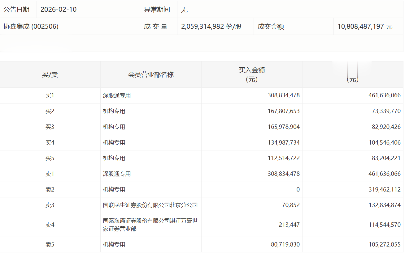 人民财讯2月10日电,协鑫集成今日涨4.37%,成交额108.08亿元,换手率35.24%。盘后龙虎榜数据显示,深股通专用席位买入3.09亿元并卖出4.62亿元,4家机构专用席位净买入2.37亿元,2家机构专用席位净卖出3.44亿元。