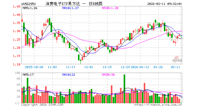 2月11日,消费电子ETF易方达(562950)开盘跌0.47%,报1.270元。消费电子ETF易方达(562950)重仓股方面,立讯精密开盘跌0.58%,寒武纪跌1.09%,工业富联跌0.84%,中芯国际跌1.89%,京东方A跌0.23%,兆易创新跌1.69%,澜起科技跌1.46%,东山精密跌0.69%,豪威集团跌0.02%,生益科技涨0.70%。