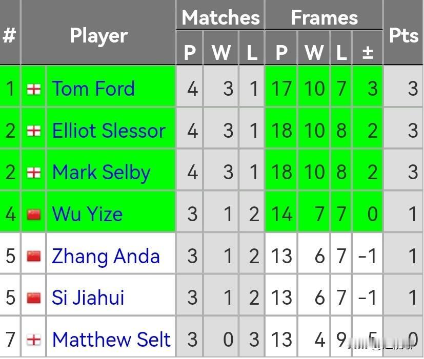 斯诺克冠军联赛胜者组和世界公开赛资格赛两项比赛几乎在同一时间进行,这赛程安排真的是够奇葩的。 目前胜者组里第一天的比赛里汤姆福德,斯莱瑟和塞尔比都是3胜1负暂居前3位。吴宜泽、张安达、斯佳辉同样是1胜2负,分列4-6位。只有塞尔特3战皆负目前垫底。 而玉山资格赛那边常冰玉,雷佩凡,徐思、姚鹏程、张家玮,贺国强晋级。刘宏宇和刚夺冠的吴安仪遗憾被淘汰。今天晚上6点,周跃龙,范争一等中国球员将陆续亮相。